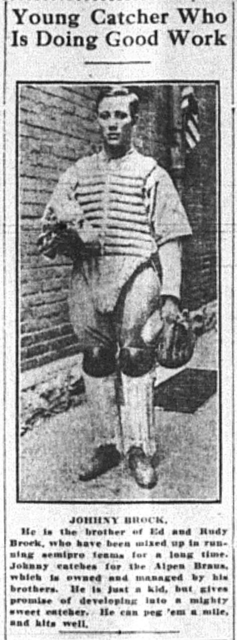 Photo of a very young Johnny Brock, pictured in 1913 while playing with an amateur club (the Alpen Braus) owned by his brothers. Photo is from the St. Louis Times of July 6, 1913. There are also some photos of him on Ancestry.com, including one of him in uniform at the park talking with St. Louis mayor Henry Kiel in 1918.