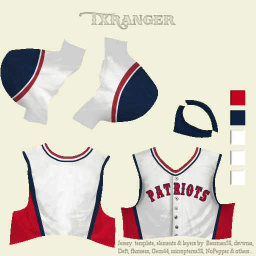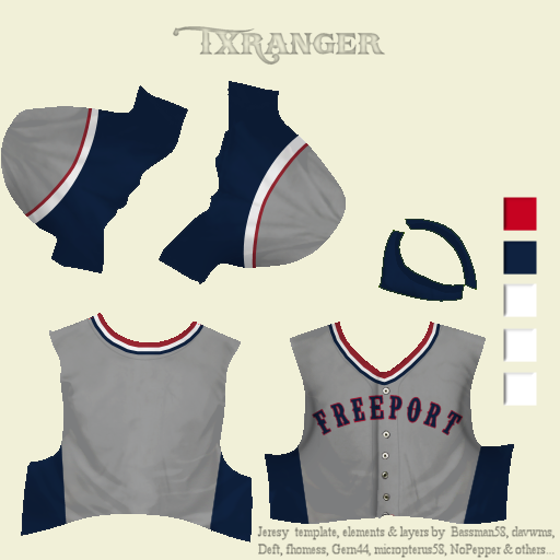 TX, I'm feverishly working to put together a century retrospective for my fictional league, and I'm hoping to spruce up some more of the teams.  Can you help me out?  Tops on the list are the storied "Freeport Patriots."  Below are the cap and uniform.  I'm actually quite happy with them (you made the jersey, I believe, for someone else).  I think I mish-mashed another cap creation and cobbled the cap and uniform together.  Now I need things streamlined a little bit so everything matches. To give you an idea, the team was established in 1871, and the year in the league is now 1987.  I believe it was you who made a fantastic circular logo with the team's city and name on it, which was perfect for the era.  Now I'm looking for something elegant and classy to match the times.  Think Boston Red Sox (as much as I may dislike them).  Thanks sir!