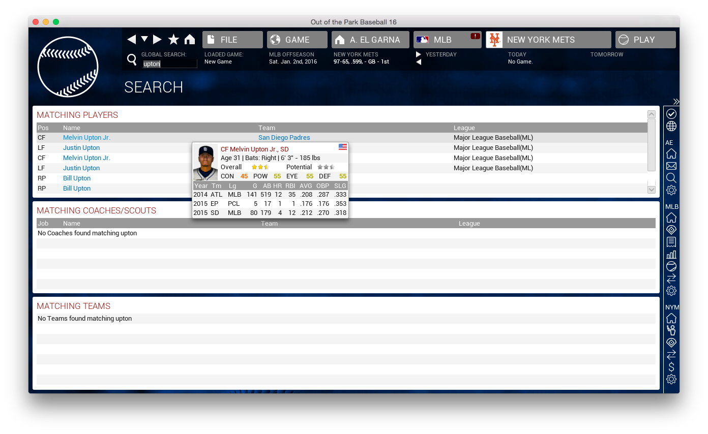 Make sure you are in Broadcast View 1. Start with one-pitch mode. 2. When the play result is on the screen (the play-by-play is finished), open up a player's screen by clicking on his name on the field or in the line-up box. You want to get to his actual page, not just the pop-up box. 3. When you come back to game, it's almost guaranteed that something weird will happen, such as the same batter still being at the plate even though he just reached base or made an out, or he is at the plate in the game window but the play-by-play text refers to the next batter in the lineup. Now switch to Webcast View or 3-D View and repeat. I can't get the bug to reveal itself in either of this views. When I click on a player's name to bring up his page, the game moves to the next batter in the lineup-- just as it is supposed to. It would be nice if someone could repeat this test and tell us the results. Some more information: 1. I'm using a Macbook Pro, with OS 10.10.3. Does this bug show up for users with MS-Windows? 2. I changed my Trackpad settings from 'tap' to 'click' and saw no change in OOTP's behavior. 3. I turned off the Player Popup boxes and saw no effect (the bug shows up in Broadcast View whether the Popup boxes are on or off). 4. I can 'activate' the bug for both a team that I control and a team controlled by the AI--in Broadcast View. 5. You will get similar weird results in Broadcast View if you pitch-by-pitch mode. For now, it appears the safest thing to do is AVOID THE BROADCAST VIEW if you are playing out your games. Use the Webcast View or the 3-D View. But again, someone should confirm. Thanks.