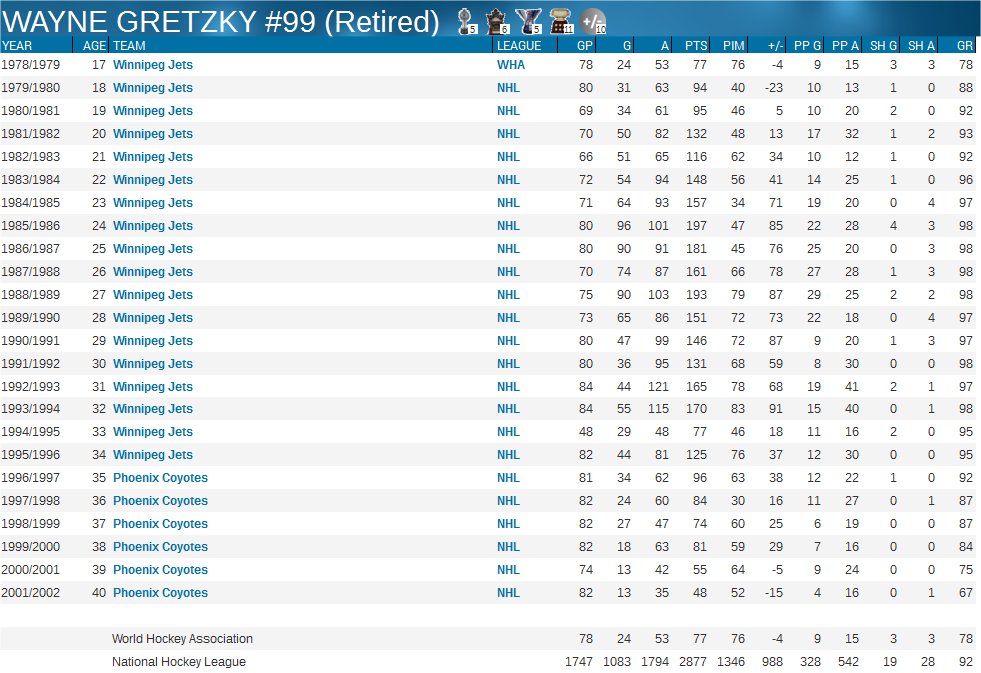 88-89 had to be one of the best teams of all time as the Jets went 68-9-3 led by Gretzky (193 points), Messier (131), Bourque (101) and goalie Rick Wamsley (57-7-2, 2.67). Here are the career and single season point leaders as well as Gretzky's year by year totals. Gretzky and Lemieux (who played his career with Quebec-Colorado) had a number of meetings in the Stanley Cup Finals. It took Gretz a few years to take off in Winnipeg but he was completely dominant in the 80's just as in real life.