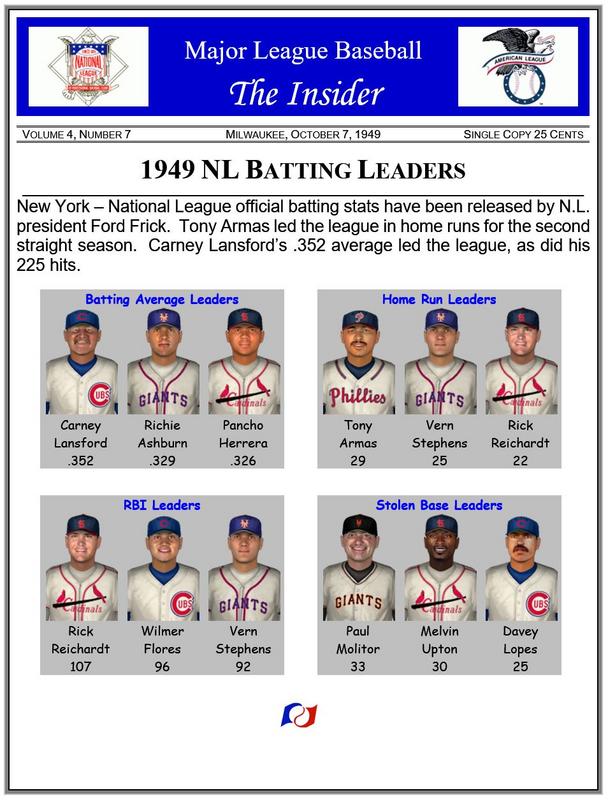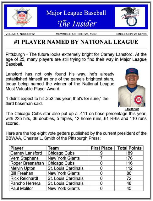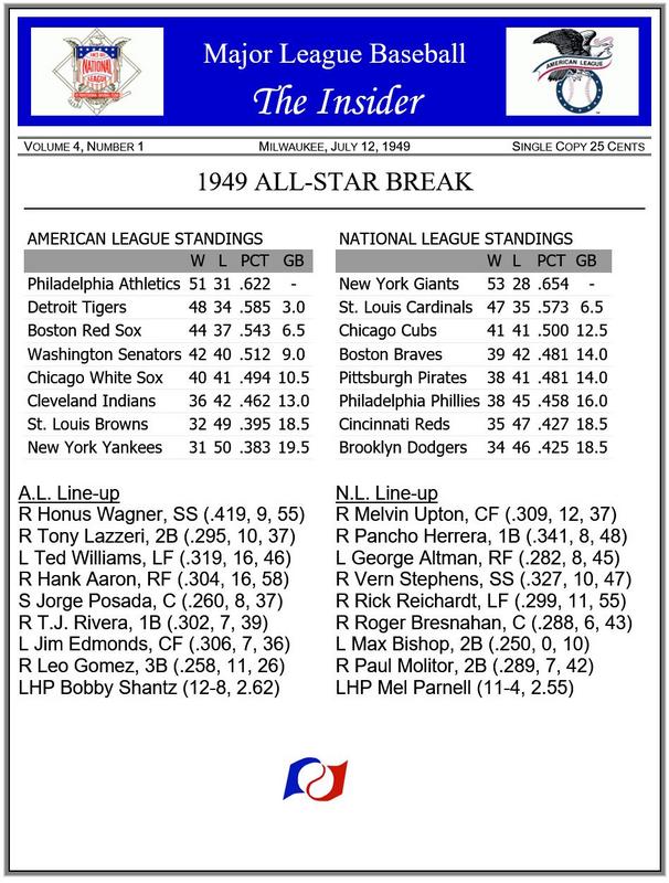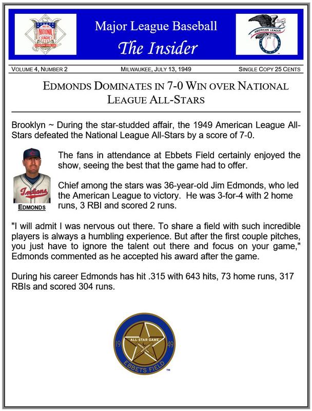 ![]() Real Life Comparison JIm Edmonds, at age 36, did not make the All-Star team while playing for the 2006 St. Louis Cardinals. He was in 4 prior All-Star games. On Deck ~ 1949 final standings |