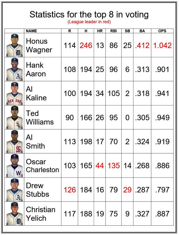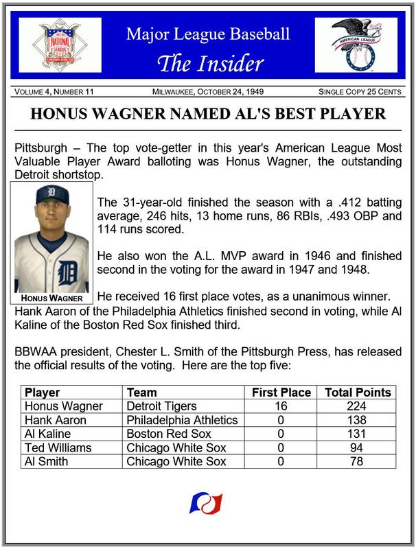 ![]() ![]() Real Life Age & Stat Comparisons Honus Wagner...age 31...1905 Pittsburgh Pirates: No MVP award that year Hank Aaron...age 27...1961 Milwaukee Braves: 8th in MVP voting Al Kaline...age 21...1956 Detroit Tigers: 3rd in MVP voting Ted Williams...age 30...1949 Boston Red Sox: Won the A.L. MVP Award Al Smith...age 25...1953 Cleveland Indians: Received no MVP votes On Deck ~ National League MVP Last edited by Jeff1787; 10-11-2018 at 03:58 PM. |