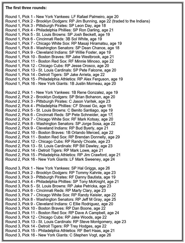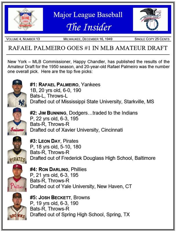![]() ![]() Real Life Age & Stat Comparisons Rafael Palmeiro...drafted by the Chicago Cubs in the 1st round (22nd overall) of the 1985 Amateur Draft Jim Bunning...signed by the 1950 Detroit Tigers while attending Xavier University Leon Day...signed by the 1934 Baltimore Black Sox of the Negro National League Ron Darling...drafted by the Texas Rangers in the 1st round (9th overall) of the 1981 Amateur Draft Josh Beckett...drafted by the Florida Marlins in the 1st round (2nd overall) of the 1999 Amateur Draft On Deck ~ 1950 All-Star break |