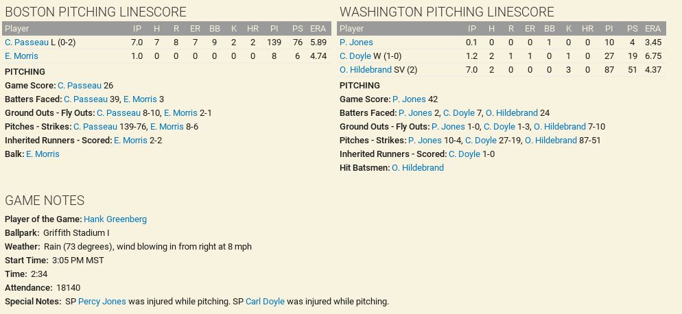 So neither exception covers this situation. Doyle, a reliever, was the Washington pitcher when the Senators took a lead that they did not relinquish. Although he only pitched 1.2 innings and gave up a run, he didn't give up the lead, so I'd consider that effective. The scorer can exercise judgment under Rule 9.17(b) when a starter would otherwise qualify for the victory but for the fact that he didn't pitch five innings. But here Jones, the starter, couldn't have qualified for the win because he wasn't the pitcher of record when his team took the lead. OOTP made the right call here. I'll just add that there would be an incentive for modern-day scorers to make a similar decision, even if Rule 9.17(b) applied. Suppose Jones pitched the entire first inning, and then Doyle pitched 1.2 innings before handing the ball off to Hildebrand. The scorer could then use his judgment under Rule 9.17(b) to award the win either to Doyle or Hildebrand. But if you award the win to Hildebrand, nobody would get the save. Now Doyle is mad that he didn't get a win, and Hildebrand, if he's a reliever, is mad because his main stat is the number of saves he records. On the other hand, if you give the win to Doyle, Hildebrand gets a save. Prizes for everybody! And then Doyle and Hildebrand can go into their contract negotiations in the off-season and brag about how many wins/saves they earned.