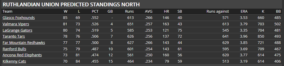 The Ruthlandian South Division is another tight cluster of clubs... the Claxton Diamonds might win their second pennant in a row, but it will definitely not be easy... Waleska, San Dimas, Belair Beach and St. John will have a few things to say, too... absolutely no clear-cut favorite... neither the RU North winner, nor the RU South winner, is expected to do much in the postseason... both divisions are weaker than the RU East and RU West.