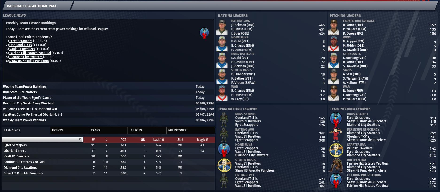 WRVR – Diamond City (6-9) AT Oberland T-51s (9-6) KNOW THE STARS DC: SP X10-44 Mannson – Staff ace Mannson is an eligible synth in the league because he agreed to the Human Aging Serum Management Assistance Technology (HASMAT) program. He was drafted in the second round, 32nd overall. Though his numbers do not look spectacular (2-3, 5.94 ERA) for a traditional baseball league, he has been a solid pitcher in the Railroad League. He is the leader of the second-best starting pitching rotation (6.16 ERA) in the RL. OBE: 1B Curtis Slingshot – For a team dominant on the offensive side of the ball, Slingshot has stood out as the most dominant. He is third on his own team in batting average (.436), but leads the team in home runs (5, tied for 2nd in RL) and RBI (21, 2nd in RL). The 10th round, 231st overall, pick of the T-51s has been a steal early in the season. He has been criticized for being selfish, but he has most certainly helped his team win. PLAYER VS PLAYER – GAME ONE LINEUPS AND STARTING PITCHERS TEAM ANALYSIS Diamond City is currently in a three-way tie for fourth (last) place in the RL. The Swatters got off to a slow start, including being swept in Week 2 by the Vault 81 Dwellers to put them at a 2-6 hole early, but they have been slowly improving since then, going 4-3 since that point. Still, they will need to get better quickly to have ac chance against Oberland. The part where the Swatters must show improvement the most is in its offense. They are last or nearly last in almost every category except home runs (13, tied for 3rd). They are 4th in runs scored (90), but last in batting average (.289), on-base percentage (.361), and have only one stolen base this season. Pitching is the only reason they are 6-9 right now. The T-51s have been steady, winning three of the first five series, including a sweep of Vault 81 two weeks ago. The series loss at Egret last weekend dropped the T-51s a game behind the Scrappers, but they are in a great early-season position to be a playoff contender. Every part of the T-51s’ success has been about its offense. They are first in the RL in runs scored (126), batting average (.378), on-base percentage (.434), and Batting WAR (3.7). They are also tied for 3rd with Diamond City for home runs (13). The entire starting line up is hitting at least .300, with 3B Jeremy Bugs leading the team (.469) and 2B Jonathan Abern taking up the rear (.302) despite his 16 RBI in 15 games. This team can hit! PREDICTIONS T-51s 8, Swatters 6 T-51s 13, Swatters 7 T-51s 16, Swatters 5 CBO Full Schedule
