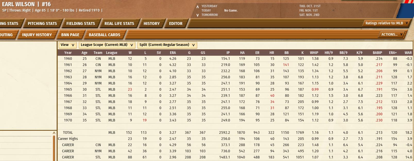 I found that Earl Wilson imports at 18 feet tall. When I edited this to his actual height his BABIP against returned to something realistic. There are a a few players in the database with this issue, Greg Minton is over 15 ft tall and there are some other players under 5 ft tall too. This should be easy enough to find and correct these problems in the database master file.