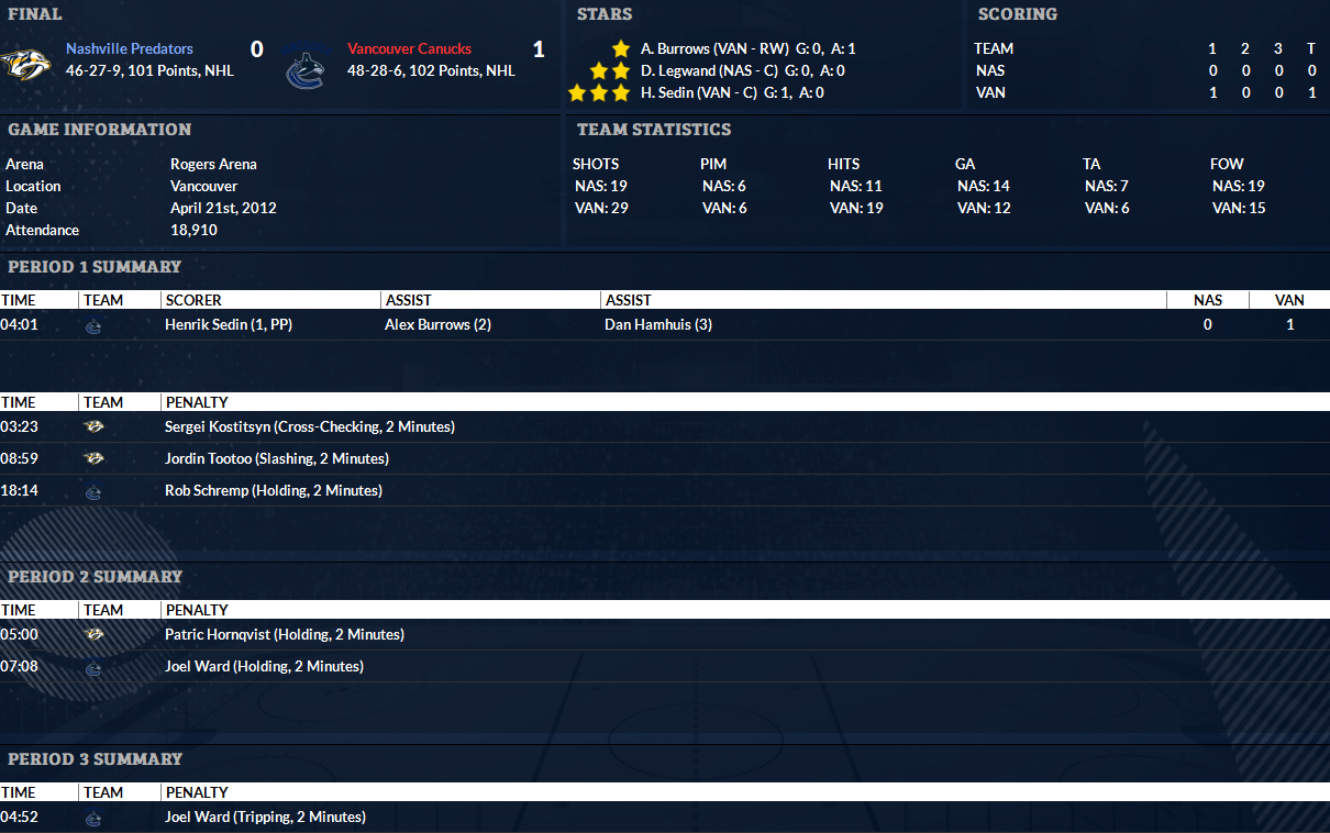 Here we go boys. Another big 1-0 shutout win by Marky to propel us to the 3-2 series lead. Another Sedin (Hank this time) goal assisted by Hammer and Burr for the only marker of the game.