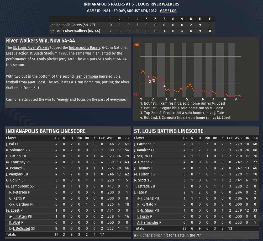 Zack Hunsicker starred on the mound and at the plate as the St. Louis River Walkers routed Quad City 10-1 at Busch Stadium (1997). On the mound, Hunsicker (8-6) allowed one run on three hits over the first seven innings. The right-hander struck out nine and walked one. At the plate, Hunsicker was 2 for 3 with a home run and four RBIs. St. Louis broke the game open early with a five-run bottom of the first inning. Two batters in, it already was 2-0 as after Jean Carmona opened the inning by reaching on an error by Thunder third baseman Paul Totten, Jose Ramirez crushed a 2-2 pitch from QC starting pitcher Pascal Marcovicci 450 feet into the batter's eye in center. The Walkers added three more runs before the inning was over. Nick Shaw plated the first one with a single. Hunsicker took care of the other two with a two-out single. Shaw collected his second RBI of the game in the third with another run-scoring single off Marcovicci. St. Louis hit a pair of homers off reliever Scott Reeves in the fifth to go up 9-0. Peter Ahn, back in the majors for the first time since 2030, hit a solo homer. After a walk to Matt Fulton, Hunsicker cracked his second homer of the the season, a two-run shot. Nick Ruffalo pitched a scoreless eighth for the Walkers. Andres Hernandez did the same in the ninth, despite allowing a pair of hits. |