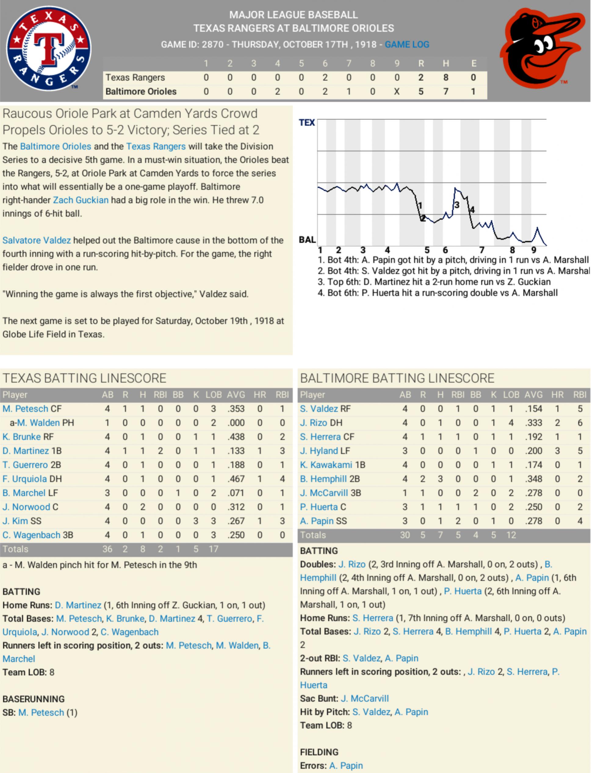 1918 Well, hello there, everybody — this is Mel Allen, and how about that! The Baltimore Orioles’ quest for a fifth World Series crown came to an end this afternoon in Arlington, Texas — and oh, what a heartbreaker it was. For seven and a half innings, it looked like the Birds might be flying on. They carried a 3–2 lead into the bottom of the eighth, their pitchers had danced out of trouble, and you could almost feel the city of Baltimore holding its breath. But baseball, folks, is a game of sudden turns. And in that eighth inning, the Texas Rangers turned the tables in a hurry. With the bases loaded, it was Jung-hoon Him who came through first — a sharp single into right to bring home the tying run. The crowd roared, and all of Globe Life Field came alive. And then, with two men aboard, up stepped pinch hitter Mike Walden. The pitch — swung on, a liner into left field, base hit! One run scores … here comes another! Walden delivers a two-run single, and just like that, Texas had the lead, 5 to 3. But they weren’t quite done yet. Kelly Brunke followed with a base knock of his own to tack on one more, and suddenly the Rangers were in command, 6 to 3. The Orioles could not answer in the ninth, and when the final out was recorded, the boys from Baltimore walked off the field, their season over — while the Rangers celebrated the first trip to the American League Championship Series in their franchise history. Yes sir, heartbreak for Baltimore, jubilation for Texas. The final score once again: the Rangers 6, the Orioles 3. And as these Rangers move on, they’ll meet the Chicago White Sox in the ALCS. One thing’s for sure — it won’t be easy. The competition only gets tougher from here. But for tonight, the Lone Star State is shining bright. And how about that! |