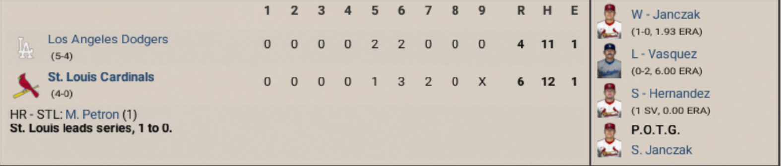 “Well, the Cardinals win this one, 6 to 4 over the Dodgers… and you gotta give a lot of credit to Steven Janczak, the veteran, 36 years old, and he went out there and gave ‘em 7 good innings. That’s not easy to do, especially in the postseason.