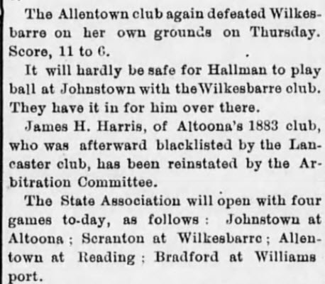James Harris also played for the 1883 Altoona team. Article on James H. Harris who played in 1883. the article is from the 1887 Altoona Times.
