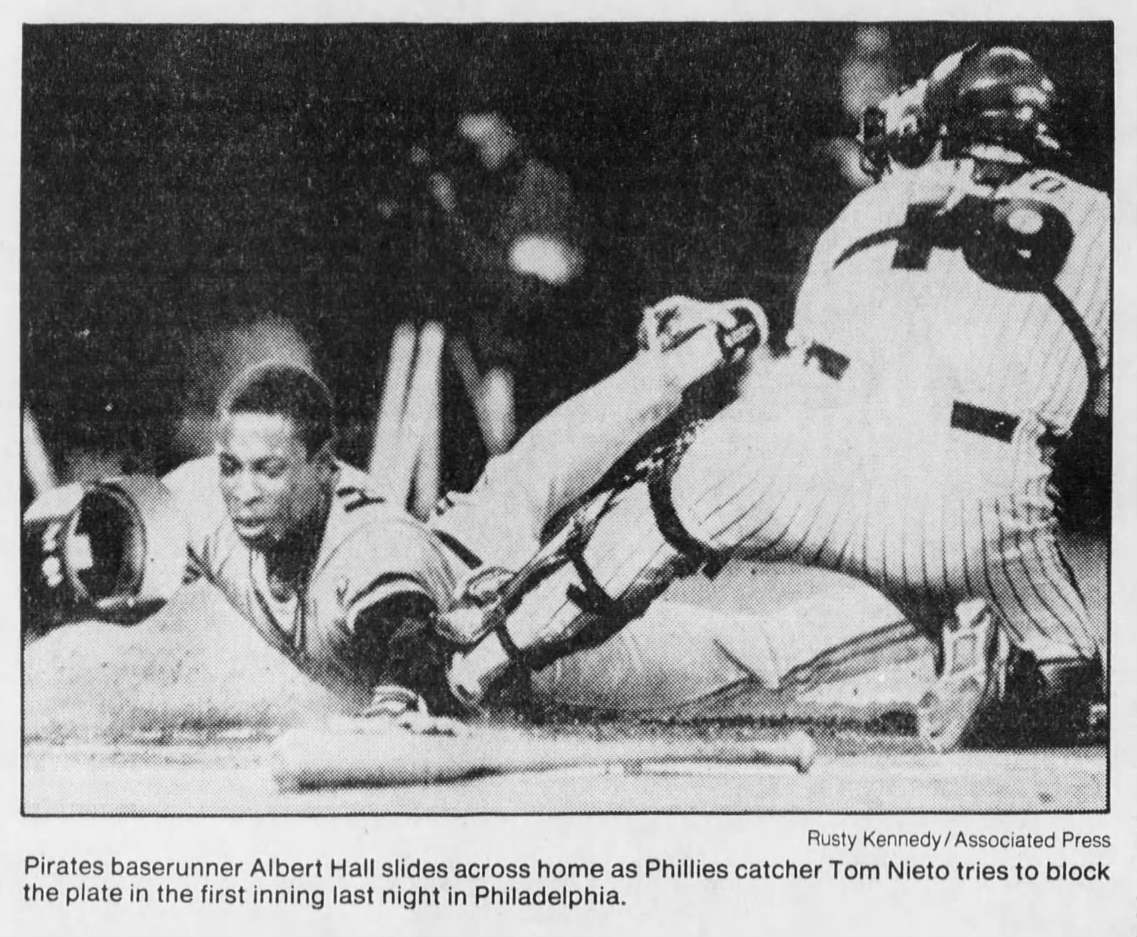 Outfielder Albert Hall is another story of a career frustrated by bad management, in this case by the Atlanta Braves organization of the 1980s. A high school draftee out of Birmingham, Alabama, Hall as a young prospect was fast, could get on base, and had some doubles and triples power. After three straight years of high OBP in the low minors, Hall was called up to Atlanta from AA Savannah in 1981, where he had compiled a mid-numbing .830 OPS. Hall got into only six games with the Braves in 81, and next year he started off at AAA Richmond. Hall would spend the next five (!) seasons yo-yoing between Richmond and Atlanta, usually hitting very well in AAA but never getting enough playing time in Atlanta to establish himself. Hall had a down year in 1985, but he bounced back strong in '86 (.373 OBP in AAA). By this time the Braves had fallen out of contention and so were finally willing to give a real chance to AAA players whom they had been neglecting, such as Hall and Gerald Perry. Hall played quite well for the '87 Braves (.780 OPS, 33 SB and just 10 CS), but 1988 was a different and sadder story. Hall hit just .247 for Atlanta that year and in the spring of 1989 he sought treatment for a drug problem. The Braves released Hall in March, 1989, just before the salary deadline. Hall filed a grievance, alleging that he had been released unjustly, but he didn't win his case. Hall was now 30 years old. He might have had a substantial ML career if the Braves had brought him up to stay earlier in the 80s, but they were now rebuilding with the younger players who would be the foundation for their 1990s success. Anyhow, Hall signed with the Pirates in May of 1989. Sent to the Pirates' AAA Buffalo club, Hall once again had a fine season, posting a .361 OBP (.767 OPS). But Hall got into only 20 major league games for the Pirates that year, hitting .182, and that was it. The Astros drafted him that winter, but Albert Hall never played again. Attached is a 1989 shot from the Pittsburgh Post-Gazette, the only image I have seen so far of Hall as a Pirate.