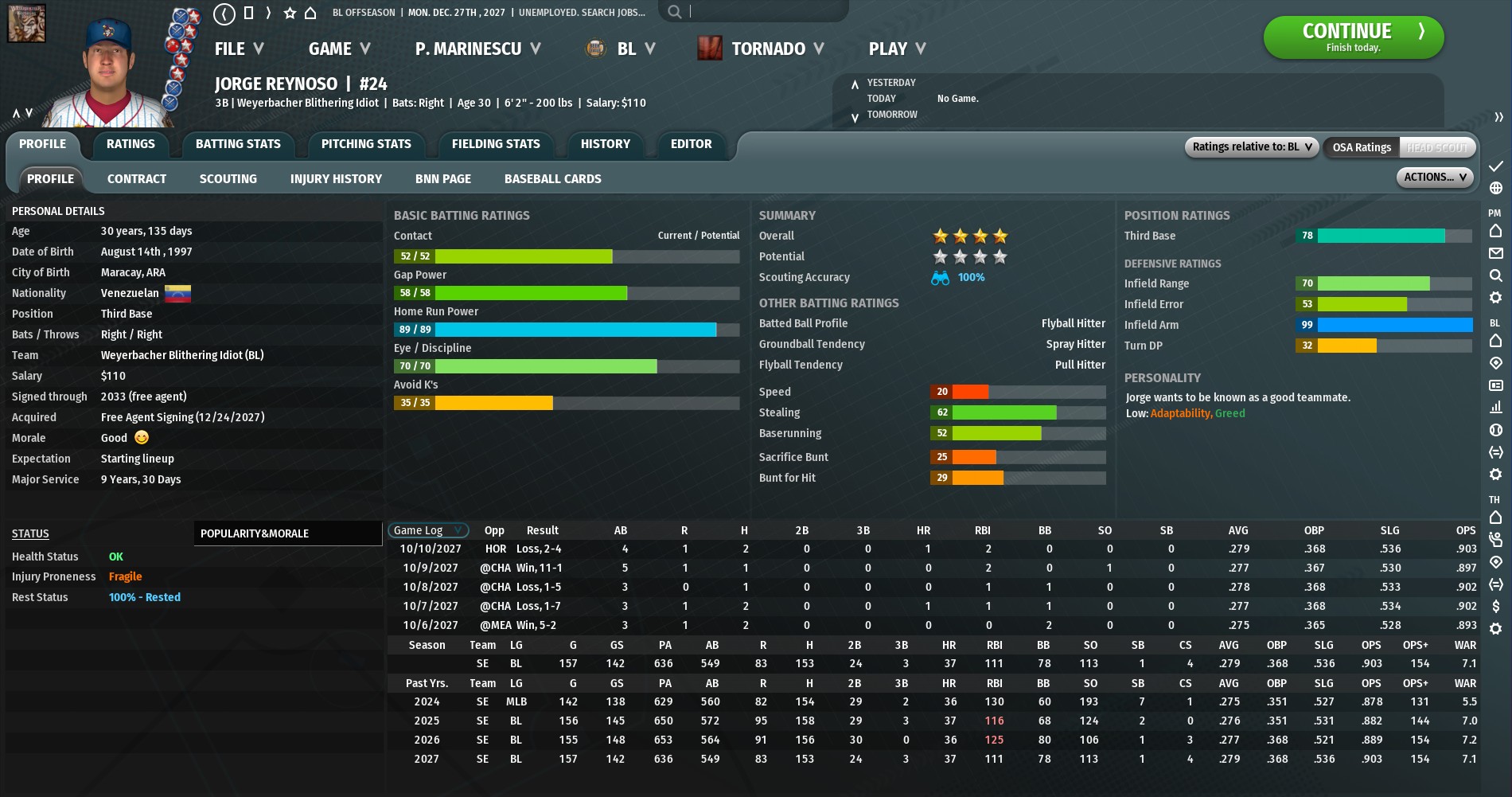 A number of top players have filed for free agency to test the market. Among them: -BCS MVP Alex Arias -2027 Pitcher of the Year Ilan Leger -David Beyer -2 time MVP George Skiff -2027 Pitcher of the Year Bobby Rodriguez |