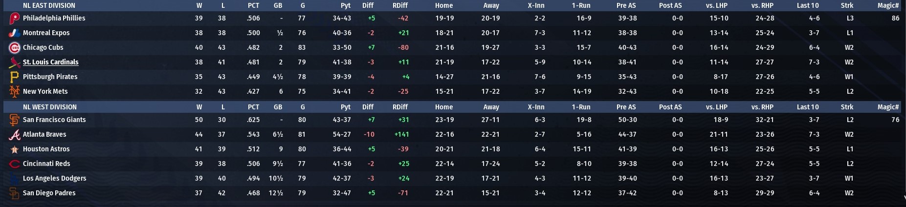 Record:37-41, 3rd/(Tied/w. Chicago Cubs), 3 GB Philadelphia