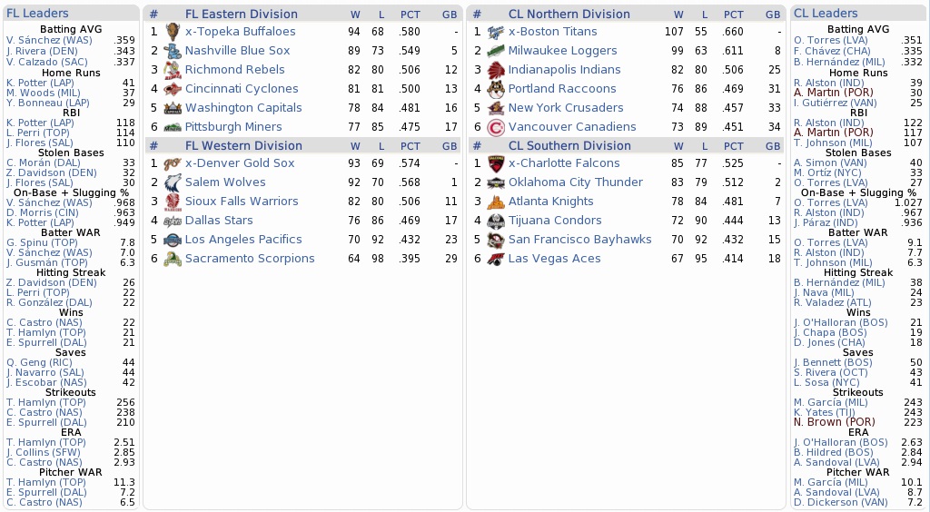 Another team that had handled the Raccoons 4-2 so far this season, the Knights had their playoff bubble burst in the last two weeks, going 6-14 in September. Glancing over their roster, it was not playoff-worthy, do be honest. 712 runs allowed, mostly on a horrible rotation, were certainly one thing that you didn’t want on the way to October baseball. That mark had them third-worst. Their 651 runs scored (7th) were not enough to carry them. Projected matchups: Randy Farley (12-6, 3.58 ERA) vs. Larry Cutts (13-6, 4.34 ERA) Edgar Amador (6-5, 4.04 ERA) vs. John Woodard (12-13, 4.19 ERA) Felipe Garcia (6-5, 4.23 ERA) vs. Sadakuno Imamura (5-10, 5.09 ERA) If Randy had pitched on Sunday in the 16th inning of that demoralizing (and maddening) loss to the Thunder, we would have reshuffled the rotation. But since he hadn’t pitched, but merely delivered a note of surrender, he was on the mound on Monday. Also, we come in with Neil Reece having had a 5-hit day on Sunday, getting to 1,884 career hits. He needs two to match Daniel Hall, just in time for the final homestand of the year. Titans will be coming in after the Knights, and the last week will be on the road. Game 1 ATL: C Vinson – SS Luján – RF J. Garcia – 1B J. Gutierrez – LF A. Rodriguez – CF F. Rivera – 2B Brantley – 3B T. Pena – P Cutts POR: SS Guerin – 3B Sharp – LF Reece – 1B Martin – RF Brady – C Thomas – CF Torrez – 2B Love – P Farley Any team batting a 38-year old David Vinson leadoff should be swiftly punished, but in an otherwise futile first run through the lineup only one hometown hero got on base, and it was Reece with a single, reaching 1,885. Juan Gutierrez singled in the first run for the Knights in the third, but they left the bases loaded before really damaging Farley’s resume. While the Raccoons briefly took a lead in the fourth on a 1-out solo homer by Al Martin and two more singles and a sac fly by Torrez, Farley was singled to death in the fifth, an inning he did not get out of. The game was tied 2-2 when Martinez appeared with runners on the corners and two outs, and he surrendered an RBI single to Ron Brantley that put the Knights up 3-2. Bottom 8th. The Raccoons had been idle for some time, but Danny Sharp hit a leadoff single against Cutts. Neil Reece had flown out to the warning track twice since his single, and now hit one sharply to Tony Pena at third. Pena intercepted it, then dropped it and couldn’t get a throw off again. The error put the go-ahead runs on base, and Al Martin’s single to center loaded them up. Ingall hit for Brady. Nothing wrong with Brady, but I longed for a steady right-handed bat against Cutts. Ingall steadily popped out to the shortstop, before Mark Thomas flew out to right, but at least we got Sharp in to make it a sacrifice. Up came Torrez, and our best right-handed bats were already gone, so what the heck. To heck with matchups – Torrez hit it out! The inning continued with a Love double and Fifield singling him home, so we were up 7-3. Scott Boone was the only guy (other than Bob the Clown) that hadn’t been used on Sunday. He was picked to get the ninth going, first facing Vinson. First pitch ball, second pitch ticketed to left center. Reece managed to cut it off while Vinson thought he had a double. Neil said NO and threw him out at second base. Boone walked Antonio Luján on four straight, but lefty Jorge Garcia was next. Garcia drilled a rocket to the right side, and luckily it was right to Matt Love, who started the game-ending double play. 7-3 Raccoons. Martin 2-4, HR, RBI; Brady 1-2, BB, 2B; Thomas 2-3, RBI; Torrez 1-3, HR, 4 RBI; Love 2-4, 2B; Fifield (PH) 1-1, RBI; Wilson 1.1 IP, 0 H, 0 R, 1 BB, 1 K; You really can’t use Boone. You just can’t use him. Vinson’s stubborn old head and luck dug him out there. On a normal day, he doesn’t get anybody out, and we lose. I’m contemplating just removing him from the roster. There’s no point in using him. Even for AWO pitching, he lacks basic skill. The win by the way went to Kaz Kichida for the first of his career. Game 2 ATL: 2B J. Miller – SS Luján – RF J. Garcia – 1B J. Gutierrez – LF A. Rodriguez – CF F. Rivera – C Vinson – 3B D. Henry – P Woodard POR: CF Torrez – 3B Sharp – LF Reece – 1B Martin – RF Beairsto – SS Guerin – 2B Palacios – C Ledesma – P Amador Dan The Man’s hits mark was tied in the first inning, when Neil Reece doubled, but was left on second base once Martin struck out. Somehow, the baseball gods did not approve, and their tears soon soaked the park and everybody in attendance. In the steady rain, Amador was quite on, striking out five in the first three innings against a lone single by Doug Henry. The Coons were up 1-0 after a run-scoring double play hit into by Ledesma in the bottom 2nd when the tarp was brought on in the bottom 3rd. The delay was brief, 24 minutes, and was followed by Sharp singling. That brought up Reece, everybody in the park onto their feet, and the electricity discharged into a single to right – NEW FRANCHISE HITS LEADER, RIGHT HERE!! The baseball gods, who wore their old #15 jerseys, still didn’t approve, and the rain restarted immediately. Nobody scored in the inning, but with two out in the fifth, Sharp doubled to bring up Reece in another RISP situation. Neil delivered, lining a string into the gap in left center, then shifted into gear, blew through second base and arrived safe at third! Technically, that was now three parts to a cycle. The fans were surely thrilled. Nobody noticed Edgar Amador spinning a nice start that was curtailed by the rain, but he went six shutout innings, striking out nine. However, as soon as the bullpen took over, the splendid effort and the 2-0 lead were shattered to nothing more than dust. Moreno came on, put two men on, and left for Bruno. With two in scoring position and one out, Bruno surrendered a fly to deep center to James Miller. Torrez chose the worst poss