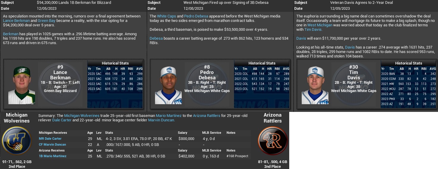 We have 39 of 40 roster spots taken, with Pimentel and Swagat on the 60 day. Both are still a few months out. We will not select anyone in the rule 5, and I think we may lose 1-2 players. Edmonton selected SP Chris Dicken in round 2. IBL SINGLE SEASON RECORD: STOLEN BASES 80 Jimmy Rollins (LA) 72 Ichiro Suzuki (AAA) 70 Jimmy Rollins (LA) 65 Carl Crawford (BUF) 64 Carl Crawford (BUF) 12/5 Lance Berkman's coming to Chicago, as a visiting Green Bay 1B. Monster deal. 12/9 Damn, that's a HUGE trade for Arizona. Martinez is a 25 year old superstar in the making coming off the 2023 Rookie of the Year award. |