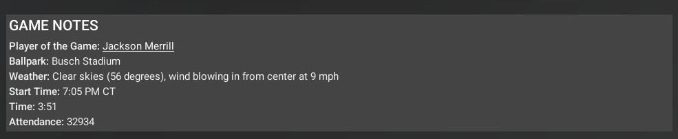 Record: 0-1, 3rd/(Tied/w. Milwaukee and Cincinnati), 1 GB Chicago Cubs