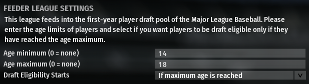 Most of the settings are the same as the NCAA league. Feeder League Settings Players come in at age 14 and all players are created at that age. Most of the high potential high schoolers get drafted into the MLB right away and very few end up in college. I couldn't find a way around this without creating way too many leagues. Playoffs Since the leagues are so small, only the top two teams play each other in the State Championship series. Fictional Player Settings Players are created at 14 and 15% come from random countries. Modifiers I left these as standard. |