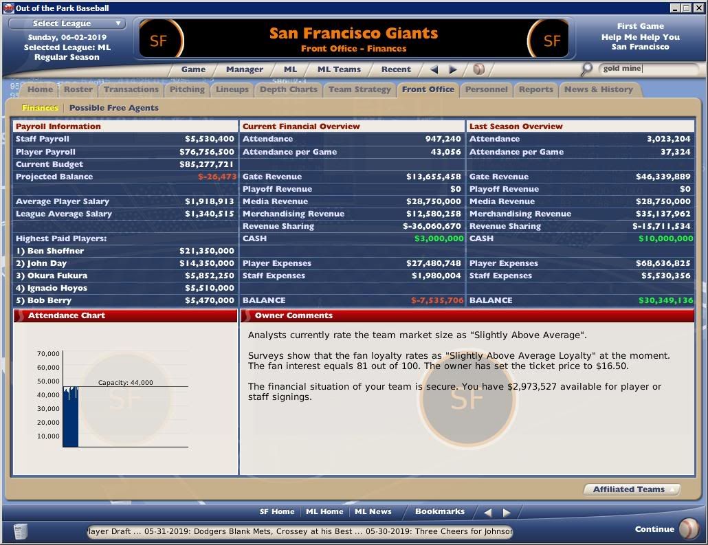 I started a new game on Jan 2: Staff Payroll: 3,587,900 Player Payroll: 44,673,500 Budget: 53,000,000 Projected balance: 3,898,600 So according to the formula, the projected balance should be 4,738,600, which is a difference of 840,000. In the Current Financial section, it lists Player Expenses as 0 and staff Expenses as 840,000, equal to the difference. Sorry if this is confusing. |