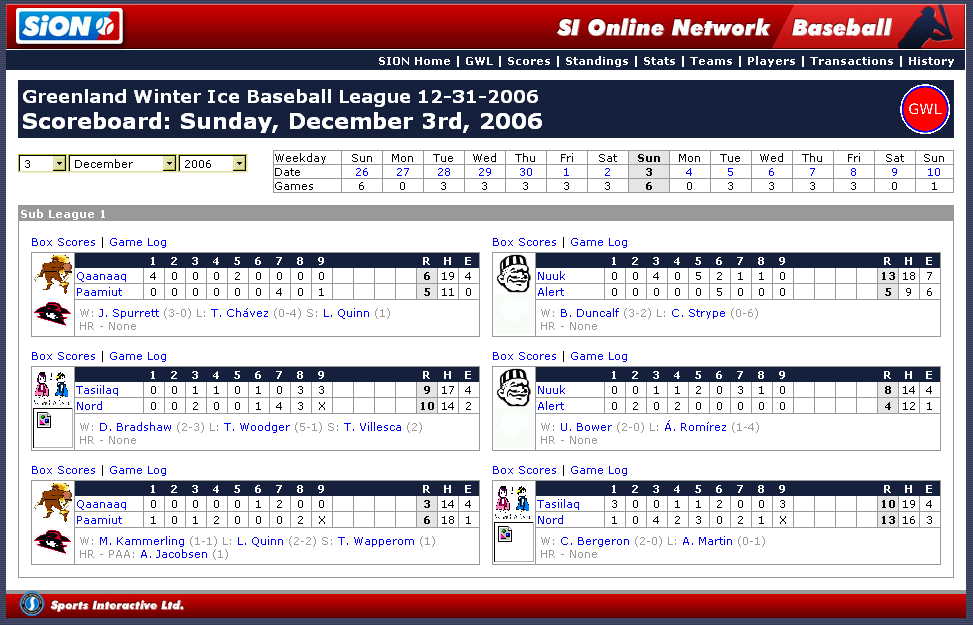 But a secondary concern was the immense distances between communities in the league. Alert is 676 km from Qaanaaq, and well over a thousand to the other stadiums in the league. Two-for-one games help to cut travel expenses and danger. In a league where games are often played in dark of months-long night with temperatures far below zero and heavy winds, just getting to your next game can be a frightful adventure. December 3rd was an unusual Sunday in the GWIBP, with some close-fought contests, and some surprising pitchers' duels. The Qaanaaq Tusk split two games with the Paamiut Legionaires, a 6-5 win and a 6-3 loss. Danish 3B Argus Jacobsen launched the only homer of the day, into the teeth of a chilly 13 mph breeze. Mandel Kammerling of Paamiut provided a stellar start in game two, going seven and allowing a single earned run. Nuuk swept the hapless Alert Desolation 13-5 and 8-4, despite committing 11 errors in the twin bill. Nord swept Tasiilaq 13-10, and 10-9, in two scores more representative of the league. In game two Tasiilaq lost despite 19 hits, including four more from Brian Bannatyne, who upped his league-leading average to .745. The 19-year old has gotten a little buzz from the greater baseball world, as several North American indy leagues have requested information on the teenage star. Nord's Dave Bradshaw, formerly of the Colorado organization, came within an out of throwing the league's first complete game. His 8.2 inning, 15-hit, 9-run performance was good enough for the win. In the nightcap he pitched another 1/3 of a inning for good measure.
