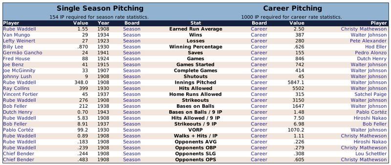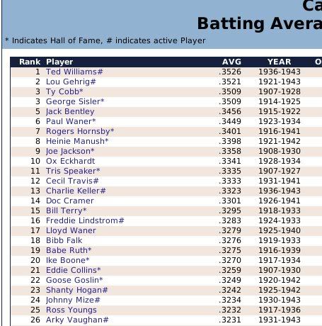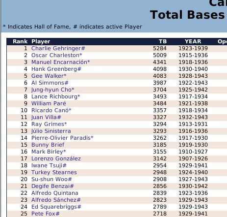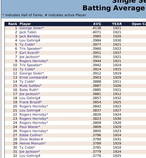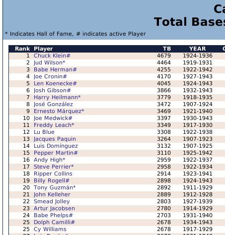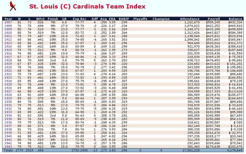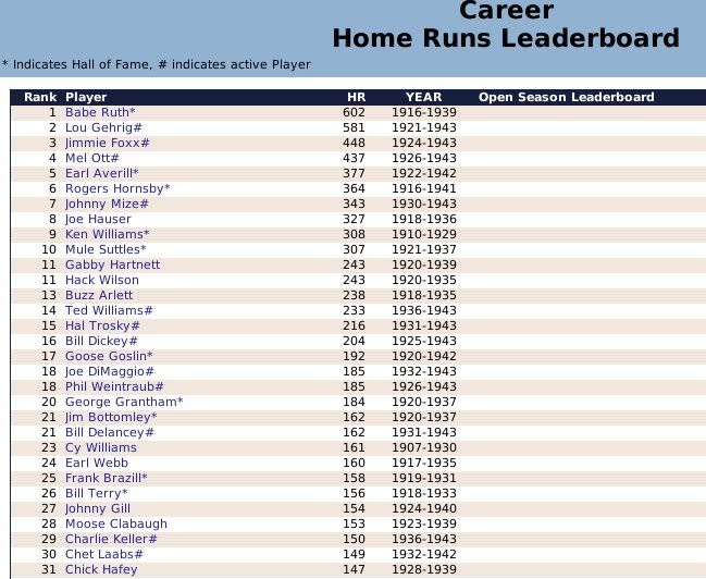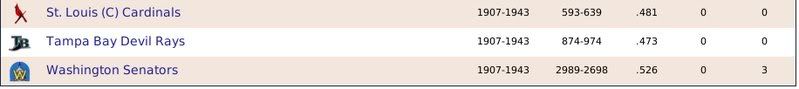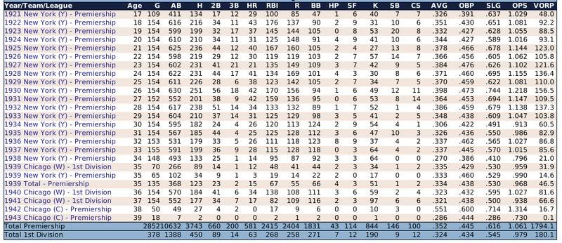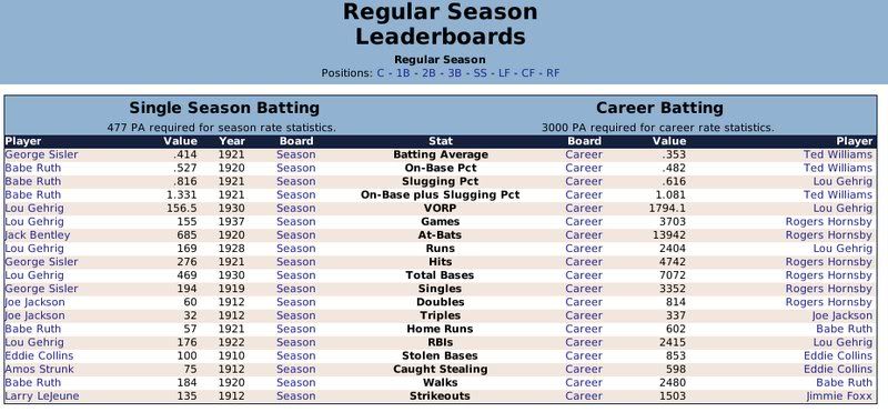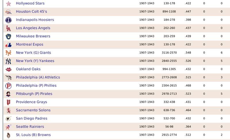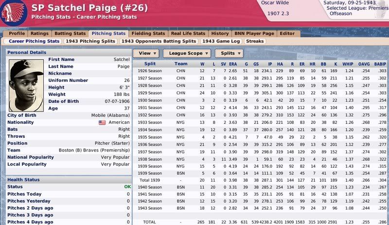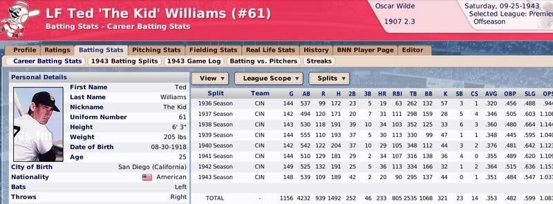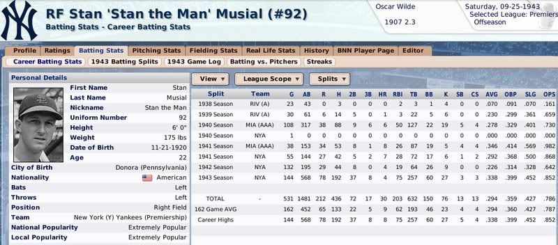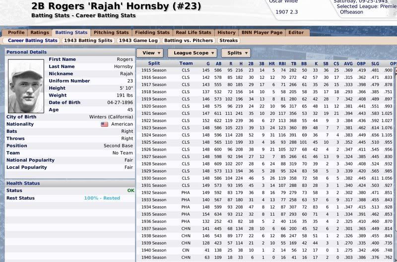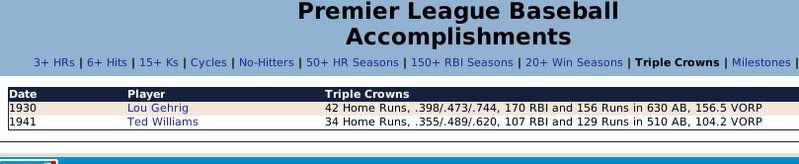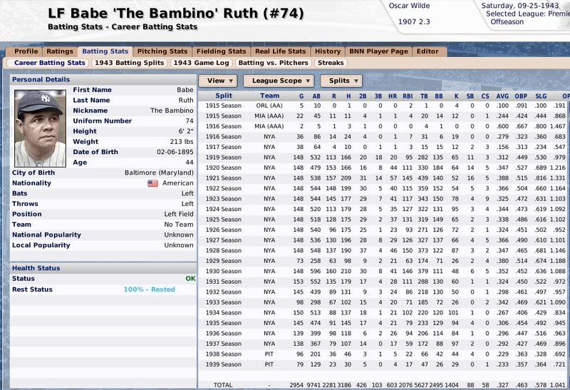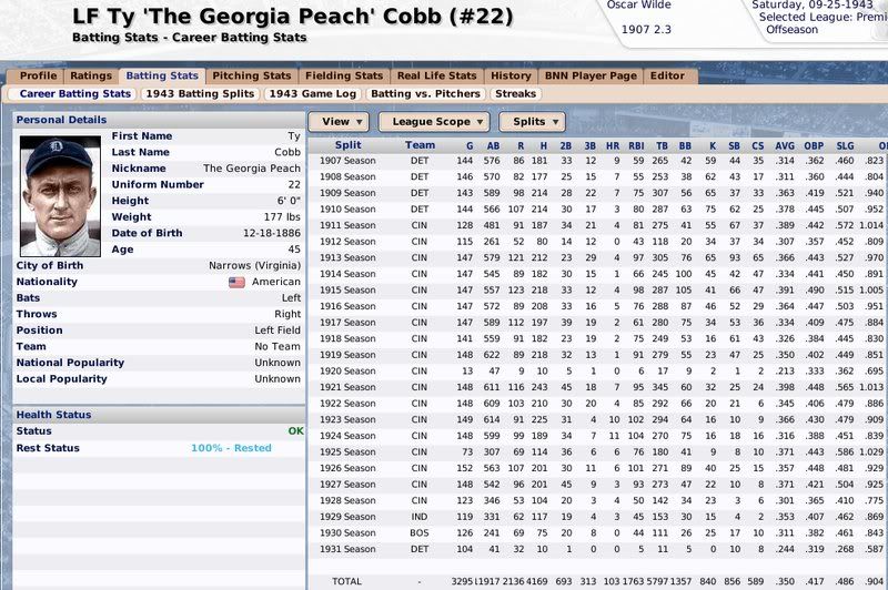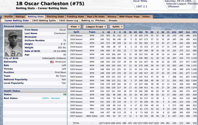 1907-1943 Ty Cobb was the Tiger that got away. Losing him to free agency, the Tigers are one of the few original 16 Premiership members that have never won a Championship. ![]() The Reds have had a few good players. ![]() The greatest player to never play within the Premiership. Oscar Charleston joined the Mets in 1915, who were two years removed from a last place finish within 2nd Division. The worst team in baseball. In 1917, Charleston quickly helped propel the Mets to a 1st Division promotion. There they would remain until suffering demotion in 1920. Charleston's bid for the Premiership continued throughout the 1920's, as the Mets finished in 2nd place three different seasons. Finally in 1930, Charleston would not be denied. Driving in 162 runs, the Mets broke through and were once again promoted to 1st Division. Sadly, a 5th place finish in 1931 would be the best Charleston and the Mets could muster in 1st Division. At the age of 36, with declining skills, a disinterest in the Big-Apple, and a dream to play his first game within the Premiership, Oscar signed a two-year deal with the Providence Grays. The Grays had finished in 4th, 2nd, & 4th place their three previous seasons within the 1st Division. Maybe a 36-year old future Hall of Famer would take them to the promised land? A 3rd place and 10th place finish would conclude Charleston's career at Providence. Never giving up hope, Oscar Charleston would sign a one year deal at the age of 39 and play 144 games for the 2nd Division Minneapolois Twins in 1936. On a whim, and perhaps simply only out of respect, at the age 40, Oscar Charleston was given a minor league deal by the Premiership's Legendary Chicago Cubs. He would only hit .247 and was not called up to help a struggling .500 Cub team. But he did hit 11 triples. ![]() ![]() ![]() ![]() Josh Gibson started within the Premier League at the age of 17, but has spent the last 12 seasons down in 1st Division. ![]() ![]() You can still click on a player's BNN tab to see their league history. Lou Gehrig below ![]() No 1st or 2nd Division team has ever won the Premiership. Champions ![]() Hitting ![]() Career Hits ![]() Career HR ![]() Career AVG ![]() Single Season AVG ![]() Single Season RBI ![]() Triple Crowns ![]() Pitching ![]() Career Wins ![]() Career ERA ![]() Career Strikeouts ![]() Single Season ERA ![]() Single Season Wins ![]() Team Championships ![]() ![]() ![]() 1st Division Total Bases ![]() 2nd Division Total Bases ![]() Then, there are the St Louis Cardinals, one of the most dismal franchises. ![]() Relegated in 1914, they have never recovered. Rogers Hornsby signed with the Cleveland Spiders, and that was that. ![]() Now things like this happen: DiMaggio's new friend -- ![]() I'm going to sim another 36 years through 1979 and will post some results. |