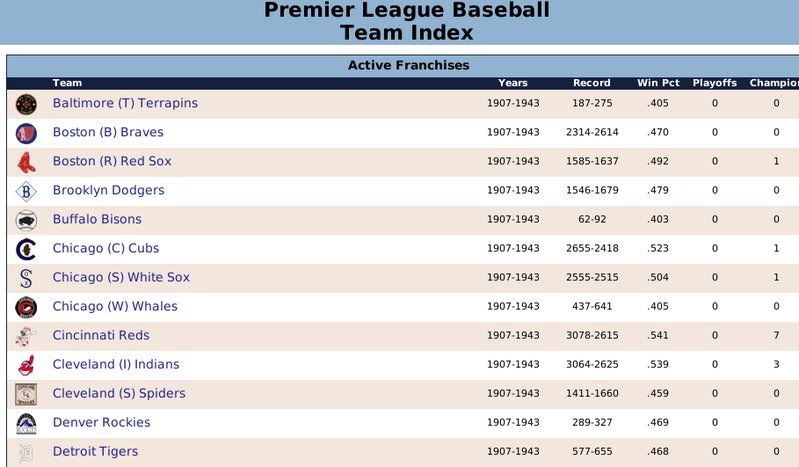 *In previous versions 1st & 2nd Division were International level leagues that progressed in a fashion that made 1st & 2nd Division lesser leagues, and fictional. In this new version they are Major League level and historical. The only thing different from Babe Ruth within the Premier League from Babe Ruth within the 1st Division, is the level of competition he faces. *Baltimore Terrapins abbreviation changed to BLT (was the same as the Orioles before) *Changed the structure of all minor league levels to the no-division/no-playoff format. *Gave 1st & 2nd division the same roster rules as the Premier League in order to provide continuity. *Added a college feeder league of 5 teams for the 1st Division. Each team gets to draft one international college player each season. *Added a high school feeder league of 5 teams for the 2nd Division. Each team gets to draft one international high school player each season. *Because of the limited drafts in 1st & 2nd Division, other fictional players do indeed enter the two lower leagues. All fictional players are limited in ability however. This allows the Historical Players to compete. *In this newest version league history has been erased. The Premier League starts fresh in 1907. In past versions I had left it in there in case somebody had needed it, but it's now gone. |