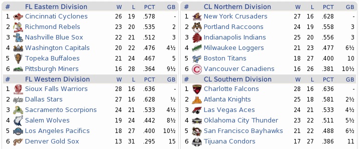 The luck ended right that evening. We got news that in an A level game our prospect Juan Martinez had torn his posterior cruciate ligament. He was out for at least nine months. We had signed him right out of Mexico this winter. We played game 2 without Ben Simon, who was a little worn out. Jeffries was in, but Simon pinch hit later in the game, grounding out. He has so far played in every Raccoons game in franchise history. The Raccoons lost 4-2 on poor offense and another shoddy performance by Christopher Powell, who gave up ten hits and all the runs in 4.2 innings. Next guy up with an inability to throw strikes as a recognized disability? Berrios. He walked four, but left a 2-2 tied game, that the Raccoons only lost through a combo of Wally Gaston walking three in the top 9th, combined with an Ed Sullivan error that cost three unearned runs. 5-2 loss. Sullivan deserved a day off along with Maloney, and both saw the Raccoons lose in ten innings, 2-1, with once again four hits. Logan Evans got a no-decision again with one run allowed in seven frames. Now, allowing only 11 runs to the Crusaders over four games, that was certainly not that shabby. Of course, it was almost all bullpen. Berrios and Powell were in a slump, and Evans was walking them in scores. And then the team scored only nine runs themselves, losing three of four. I realize I continue to sing the same song here. But at 36-45 now, the first half of the season was over, and we were 262-329 in runs. That’s actually just over three runs scored per game. We were relying heavily on the long ball, leading the CL in home runs. Almost every other offensive category (including steals with Flores losing his timing): 11th or 12th. Canadiens in Vancouver for four games next. Jorge Romero went six good innings allowing one run and Hoyt Cook later bashed the go ahead home run in the top 9th. Hatfield got his 23rd save in the 2-1 game with an amazing catch by Pedro Sánz to end the game, but then was in pain afterwards. He had a sore shoulder and was out for for one to two weeks. Which was terrible. One week, keep him and play Gaston as closer. Two weeks, disable him. One to two weeks? Gnarf. I thought about disabling him and calling up Brett Justice, but Justice was still struggling after a year on the DL, so I got Ned Ray to replace him in the pen. Gaston would close the next 15 days. There was no save opportunity the next day, when the Raccoons beat the Canadiens 6-2. They only had five hits, but were walked eight times and Ben Simon got the ship righted early with a 2-run slam in the first inning. This was followed by a 7-3 win the next night. Berrios one-hit the Canadiens in five innings, then crumbled in the sixth and couldn’t get out of there. Tony Lopez actually got his first career save, pitching the last two, entering at 5-3, before Flores homered in the top 9th. Flores, Sullivan, and Simon all had three hits. Maybe things were just slightly coming around. The Raccoons finished the four games in Vancouver with a sweep, rapping Canadiens starter Vic Underwood hard for seven runs in four innings, winning it 9-2. Logan Evans: 6.0 IP, 5 H, 1 R, 0 BB, 5 K. The kid was sometimes erratic, but this was a stellar outing for him. A warm wind was blowing through the clubhouse. Rapping the Canadiens by 24-8 runs and sweeping them in four had helped a lot to rebuild lost confidence. Sure, we had temporarily lost our closer, but the good thing was that the All Star break was up – three off days either way. Of course, it was bad for Hatfield, who, leading the ABL in saves, might have had a shot at a selection. Only the Titans left for three in Boston before the Federal League and Continental League would match up. A few guys got a day off to start the series, with Pickett and Jeffries in for Flores and Swift. Jorge Romero went the distance in game 1 as the troubled Titans pitchers were rolled up by the Raccoons, 8-1. Everything went right out of whack again from there. Boston’s Sean Critch shut down the Raccoons, while Christopher Powell continued to throw like a girl. Six runs in two plus innings, that guy was about to get shafted. Raccoons lost 9-0. Game 3 was more of the same with a 6-1 loss. Raccoons were fanned nine times and Berrios pitched five scoreless before melting down epically in the sixth. Ben Simon was the only Raccoon nominated for the All Star game. The Continental League won 3-0. Simon played the whole game at shortstop, but went 1-4 with 2 K’s. Break over, back to business. At 41-47 and very erratic play this meant to try to optimize the lineup. Dolder was out, batting below .200 and not getting plays in several times against Boston. Pickett was in CF against the Canadiens, in another four game series, this time at home. Logan Evans started the series at home and allowed two runs in the first inning. He then settled in, but the Raccoons didn’t score for him and only got moving in the bottom 8th with three runs scored by the bottom of the lineup. Gaston got his first save in place of Hatfield (second overall this season) in the 4-2 win, but walked two again – this was why he was not the normal closer for the team. Lack of control. Next game, lack of everything in a 4-1 loss. Once again only four hits, a common theme this summer. Game 3. Powell was given a 1-0 lead, but blew it. The Raccoons trailed 3-1 in the bottom 8th, with the bottom of the lineup loading the bases, and nobody out. Flores flew out, Sullivan flew out, Sánz singled in one, Simon flew out. It was both pathetic and embarassing. They loaded the bases AGAIN in the bottom 9th with one out and didn’t score at all, Johnston was thrown out at home while trying. For crying out loud!! They put up at least one strong inning in the last game for a 4-1 win and a tied series. In other news: July 2 – Harry Beauman (.314, 6 HR, 34 RBI) of the Pacifics is out for six weeks with a fractured rib. July 4 – The Indians trade Jorge Vallejo (9-8, 2.99 ERA) to L