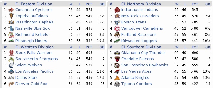 The Indians clinched the CL North right in the first game, beating the Raccoons 7-5. Gary Simmons had been highly erratic, giving up seven hits and seven walks for five runs in five innings. There was no recovery from that, only in the ninth did the Raccoons threaten again against Ben Green. But only one run scored there and the chance was missed. At one point in July, Simmons had been 5-4 with a 2.75 ERA. He had gone 2-8 with a 4.45 ERA since. With the Indians in the playoffs, the magic number was 5 for the Buffaloes, 6 for the Thunder, and 9 for the Scorpions. Only the Scorpions have made the playoffs before, so there could be as many as three debutee teams in the post season this time. Logan Evans was up in game 2. He had made a collapse similar to Simmons since July, going from 5-5 with a 3.42 ERA until early July to a 1-8 record and 5.65 ERA since then. Evans posted the following line: 6.2 IP, 8 H, 6 BB, 4 K, 4 ER. Most of the damage came in the first three innings, but I left him in, because I figured, why use up the pen, get saddled with 12 runs. The Raccoons lost 4-3, and if Evans could have sucked just a little less … never mind. Carlos Moran got the start in game 3, this time without rain. He went six innings, surrendering all runs in a 3-0 loss. Raccoons fanned ten times. And were generally awful. Fast forward, quick! Raccoons (64-91) @ Canadiens (75-80) Four games in Vancouver, last chance to top that 67-95 records from 1977 and 1978. Because, let’s face it, they will lose all three in New York to end the season. They had lost 9 of the last 11 games, and in September were 7-18 overall. Nuff said. The Raccoons led game 1 by a narrow 1-0 score for a long time, but in the seventh it got away. A flyball took an ugly bounce at Daniel Hall in left, and Ocasio served up a homer on the next pitch. Raccoons lost 3-1 despite out-hitting Vancouver 6-5. Hoyt Cook went 3-4 with 5 RBI in game 2 to pick up Christopher Powell, who had shaky first two innings, allowing a leadoff homer and another run in game 2. That was it for the Canadiens, the Raccoons won 6-2. Cameron Green hurt his back making a sprawling catch in the seventh and would have to sit out at least a few days. The offense kept on humming in game 3, helping Simmons to a 5-3 win. The Canadiens scored their runs with long balls off Simmons (1 for 1 run) and Coleman (1 for 2 runs). Gaston came on to get his first save in ages. He has just three saves in the last eight weeks! Testament to the Raccoons’ horrible late season collapse, right there. Game 4 was Evans’ last start of the season. His control was better, but he surrendered tons of hits. The Raccoons came to bat in the top 5th down 4-3. They started major fireworks and plated eight runs in the inning for an 11-4 lead. Evans was in line for an easy win. He blew it and didn’t get through the bottom 5th. With two in, two on, and one out he was pulled. This was a sad story, again, which should be contemplated over for a few seconds. Moran picked up the slack, and the Raccoons piled on in the seventh with four more runs. Wyatt Johnston entered his pinch hitter to lead off and made two outs in the inning on separate plays. ‘nother sad story. Anyway, the ninth saw a 2-run homer by Angel Costa, the most unlikely of all sources for a long ball, completing the 17-6 rout of the Canadiens and clinching the first series (3-1) in almost a month (after the 4-game series against the Titans, also 3-1, from September 4 to 7). Costa, Hall, and Sánz all were 3-5. All eight positional starters had at least one hit, and all but Ben Cox had at least two. Costa, Hall, and Simon all batted in three. Raccoons (67-92) @ Crusaders (81-78) The Raccoons need one win to post a new franchise record for wins in a season. This is sad enough, but the Raccoons’ record against the Crusaders all time is a staggering 16-53 (.232) …!! Ocasio pitched as awful as ever in game 1, but somehow got through five unhurt. That changed in the sixth, where the Crusaders scored all they needed for the 3-1 win. Raccoons loaded them up in both the eighth and ninth with one out each time, but only scored once in the eighth. Shameful. Christopher Powell got the ball for game 2, my only hope for a new best record for the Raccoons. Isn’t it sad to hope for a 68-94 record? But at least we got there. Powell did everything I asked for, scattering five hits over seven innings, while the offense produced rather well in a 6-0 win. The bullpen almost broke down in the eighth, but West and Jenkins got a K and a groundout against the Crusaders’ 3-4 pair with the bags full. Cook was 3-4 with a home run and 3 RBI. Season finale. Johnston and Zuniga started over Cook and Clark. Cook had by now wrestled the 1B starters’ job from Johnston, but the latter’s vesting option for 1981 had triggered already, so they would both be back next year. Daniel Hall bashed his 20th home run in the first inning, scoring Hermundo as well for an early 2-0 lead. Gary Simmons instantly gave it away again with homers to Cecil Ward and Hector Atilano. The Raccoons chopped the Crusaders’ Kyle Owens to pieces in the second to take a new 7-2 lead. At first it seemed Simmons was inclined to lose the game at all costs, but he settled in eventually and went six frames with four runs across. Up 8-4, many bench players got at bats and sessions on the mound. Hoyt Cook came to pinch hit with two out in the top 9th for 1-4 Johnston. He lined one through the gap at second to finish the season with a .300 average! The bullpen had a few hiccups in the bottom 9th, but Wally Gaston came in to end it, getting Michinaga Yamada to ground into a double play to end the game, 8-6, and the season. In other news: October 1 – The Buffaloes slam the Capitals 10-3 to clinch the FL East for the first time in franchise history. October 2 – The Condors acquire reliever Felix Gonzales, formerly a starter for the Warriors, from the Miners in exchange for 17-year old o