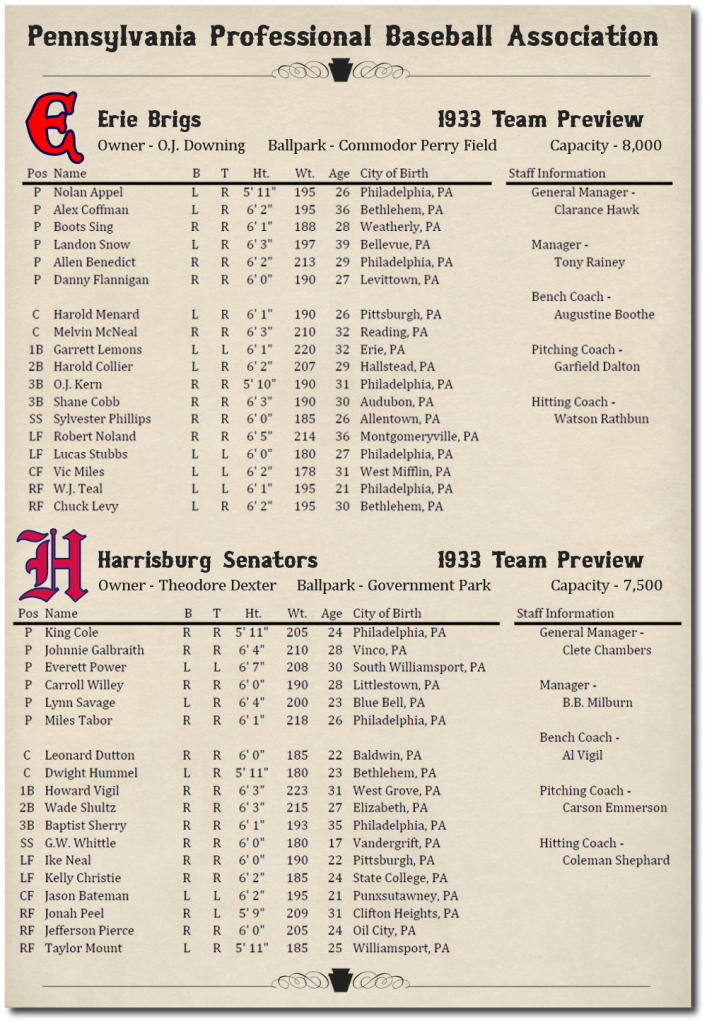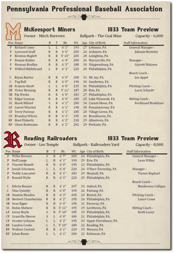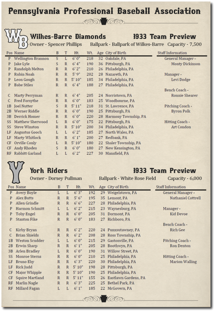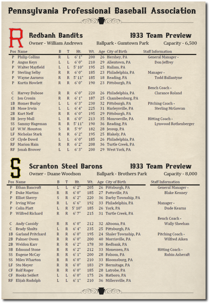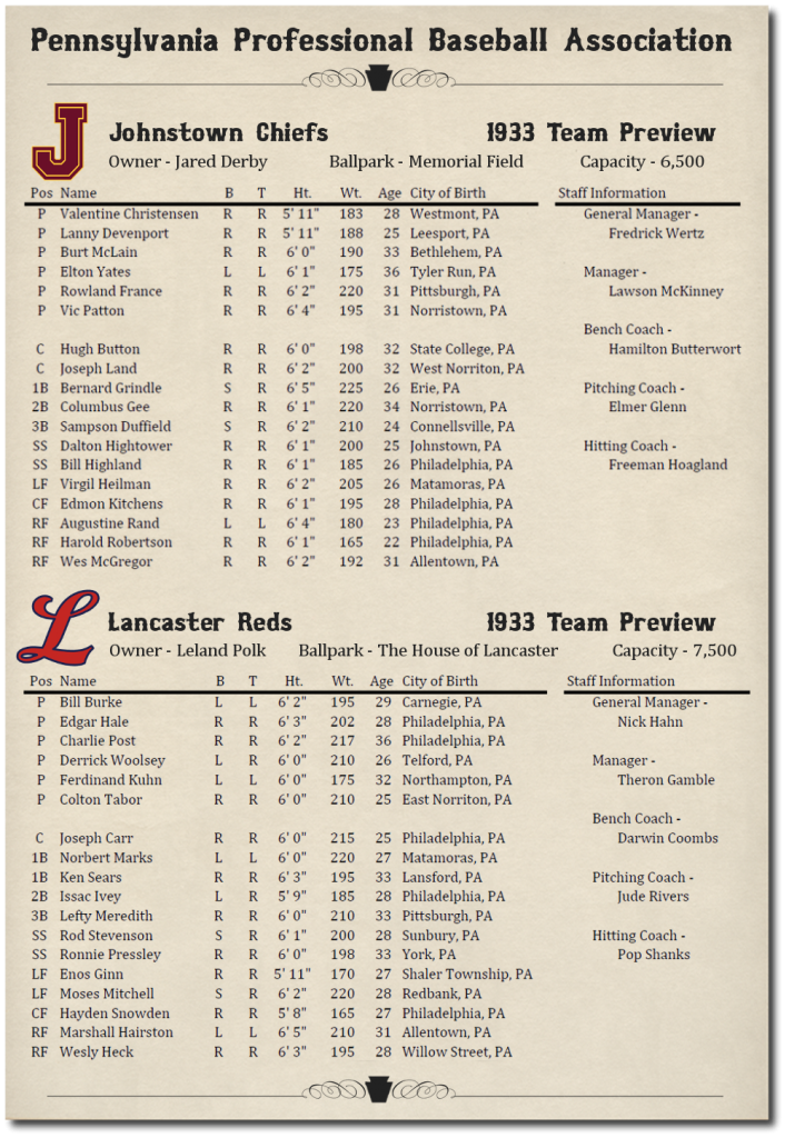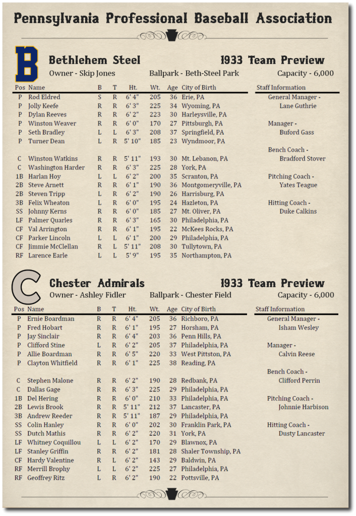 This is probably the most original,awesome and amazingly cool Dynasty Concepts brought to fruation I've seen or heard of! And I'm in early enough that I don't have to read 712 post to get caught up with it! Thanks for this. I'll be following closley! Love your team names BTW so true to the State, City and era of this dynasty! I