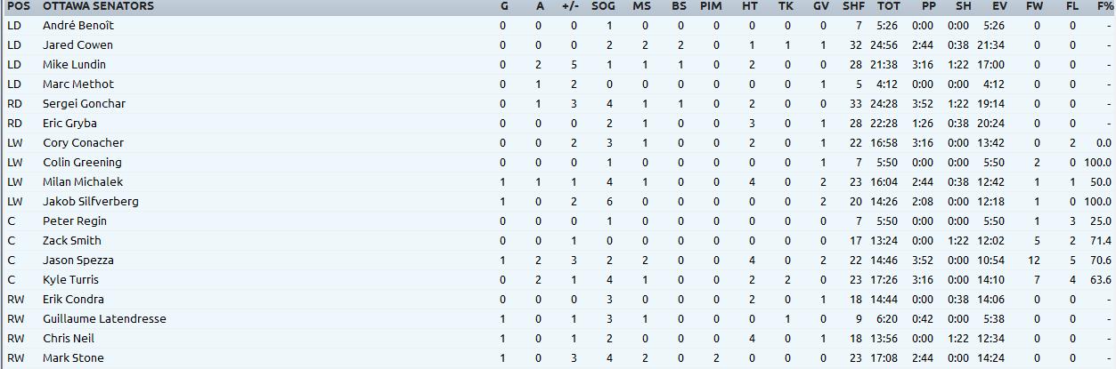 Explosion. 6 goals vs the Oil and a very solid 6-1 win. The top line dominated again, picking up 6 points combined. Spezza was the leader again with 1 goal (7) and 2 assists and Michalek (7), Silfverberg (2), Latendresse (9), Chris Neil (3) and Mark Stone (3) scoring the others.