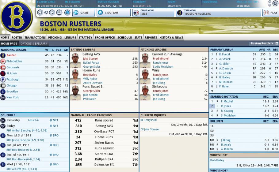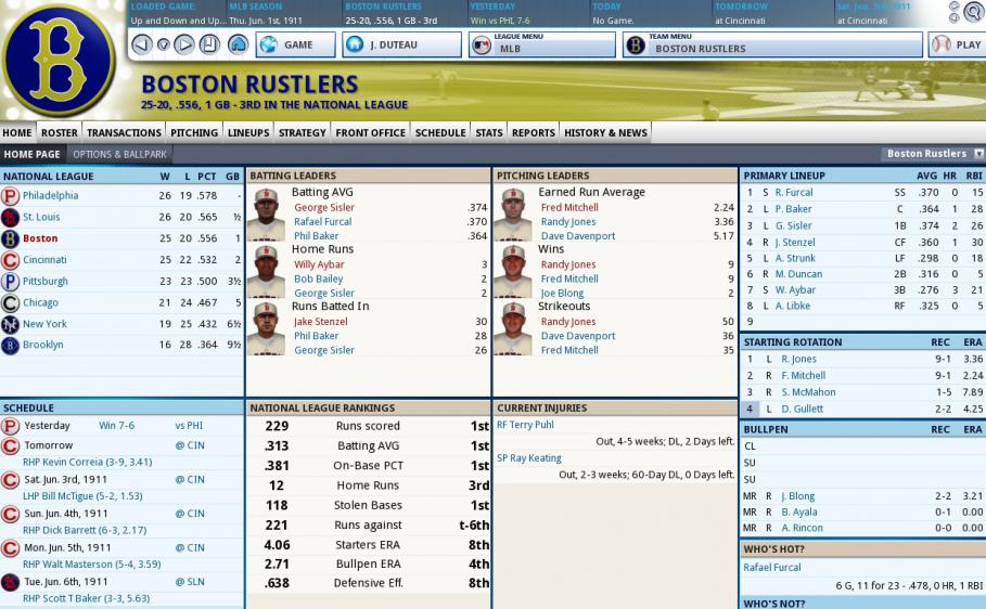 Our offence is #1 or #2 in all categories and our Runs Against is #2 even if our Starter ERA and Defensive Efficiency is 6th. George Sisler had a great season as he finished with an AVG of .375, 8 HRs, and 118 RBIs. His OBP was .426 and his OPS+ was 160. Dawson had a great season after coming over. .329 AVG, 11 HRs, 98 RBI, OPS+ of 155. Rafael Furcal had a perfect rookie season: .350 AVG, 14 Triples, 67 RBI, OPS+ of 153. He had 82 SB but 93 CS so I'd rather that we didn't send him as often, but he was all you could ask for. Randy Jones had no sophomore jinx as he went 30-8 with a 2.97 ERA and 146 Ks and 63 BBs. I feel that we're a better club and more than ready to face off against the Red Sox this time. |