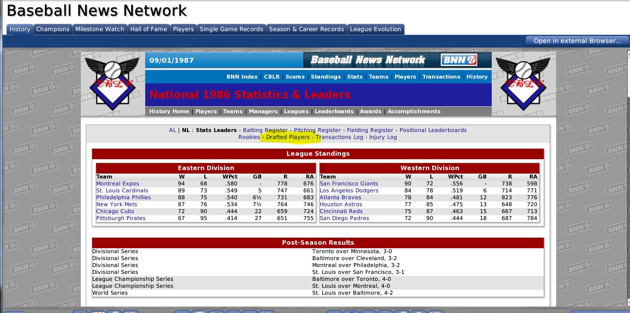 League Menu --> League History Index --> Click on the 'Lg' for the year you want to look at then click on 'Drafted Players'