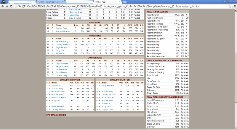I'm doing a fictional league, and in the fourth year, an Atlanta Windsurfers team is absolutely dominating the league. They lead the AL in batting average, slugging, OPS, Runs Scored, hits, extra base hits, and home runs in the offensive department, as well as in ERA, starters' ERA, Runs allowed, Hits allowed, Opponents batting average, BABIP, Walks allowed, and defensive efficiency in the defensive department. This is hands-down the most dominant team I have ever seen. If you put together the old league record for runs scored and the old record for runs against, the team you put together would have a run differential 49 runs worse than Atlanta's. The funny thing is, they don't even have the best record in the league. They had a 112-50 record in the regular season, matching the old record, but the Bakersfield Beatnicks had a 117-45 record. However, Bakersfield's luck was a lot better. Atlanta had a mind-numbing 122-40 Pythagorean W-L expectancy, as opposed to Bakersfield's 114-48. We've yet to see what happens in the playoffs, but Atlanta is the clear favorite to go all the way. What's the most dominant team that you've either assembled, or seen?
