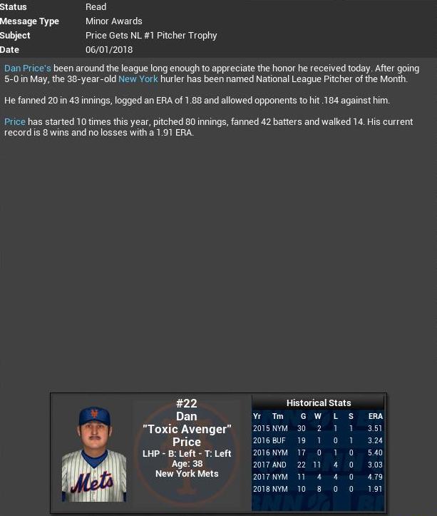 Arashikage wins AL Rookie of the Month. Cubs CF Earl Morris wins the NL Rookie of the Month award. Atlanta Muscle SP Tom Petson wins the EBL NL Pitcher of the Month Award. Mets pick up some more help.