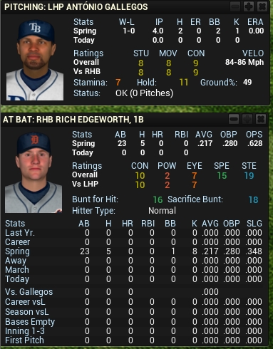 Well, you have the Game Log for what a batter did in his last at bat, but for current game stats and record versus pitcher, you need to Configure Screen and select the Expanded Batter Info box. [It's still early in Season One in my league, so no stats vs pitcher or career stats are showing.]