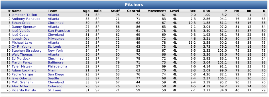 This is my rotation for the Braves in a league I am still playing in 11. They have won three WS in a row and 5 of the last 7. Taillon is on the DL right now but he has 2 Cy Young Awards and Ranaudo has 2. The league year is 2023.