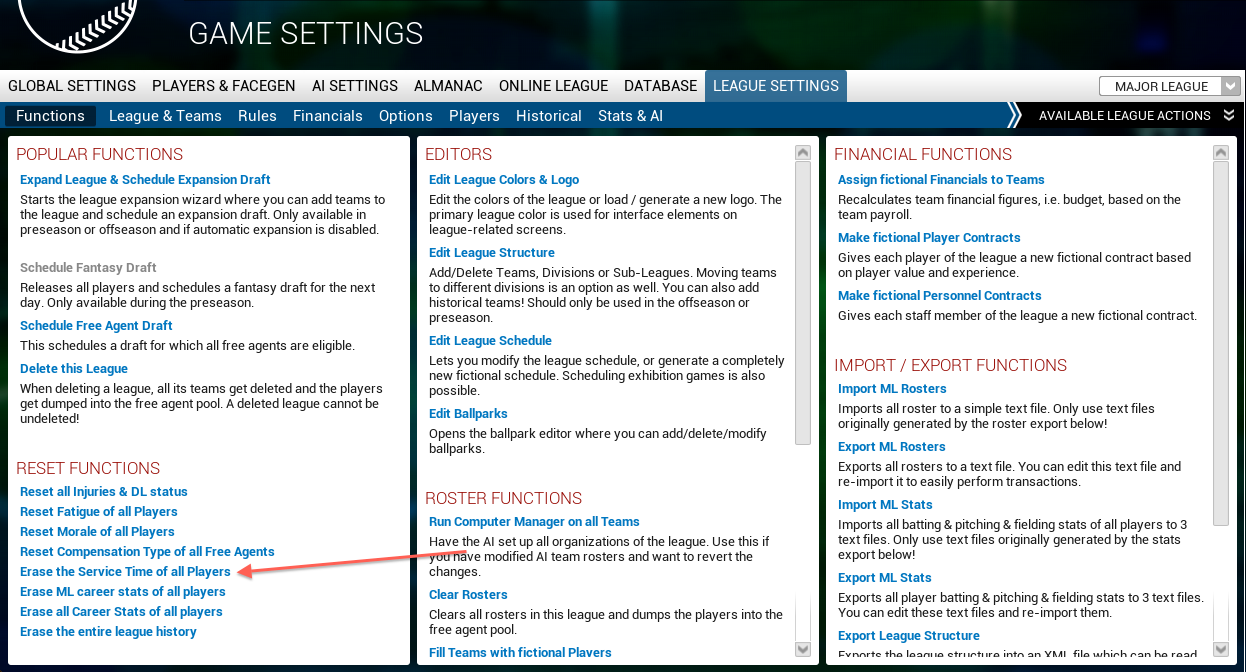 How do I reset service years in my fictional league?