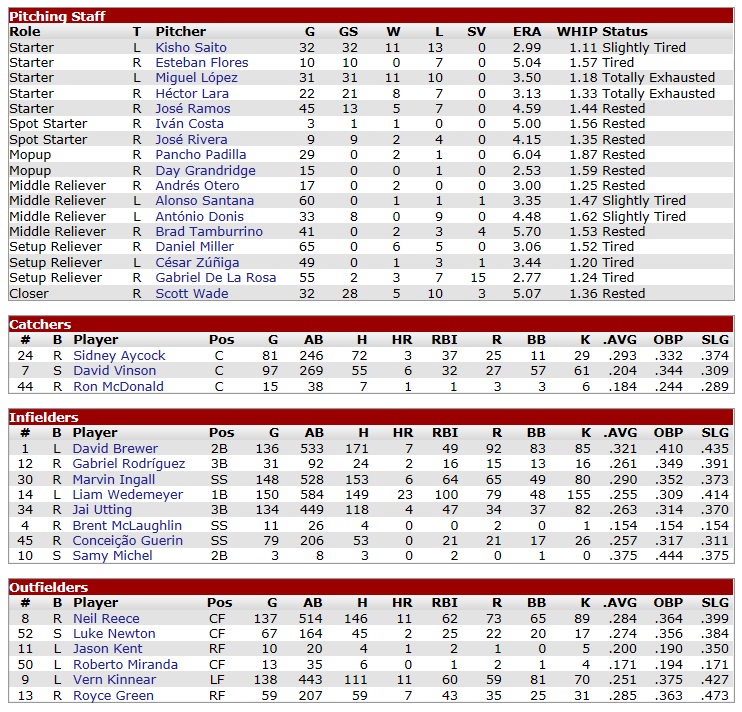 We were facing a team that was so thoroughly average that is was incredibly hard to work out any strengths to fear or weaknesses to attack. They ranked around the league average or a bit above it in any important category. If they really weren’t doing much of any one thing, it was their power department, which ranked 10th in the FL. But then again, they’re going to be compared against the Raccoons, so … Projected matchups: Kisho Saito (9-9, 3.04 ERA) vs. Marc Padgett (11-7, 3.46 ERA) Scott Wade (4-6, 5.29 ERA) vs. Manuel Movonda (11-8, 4.91 ERA) Miguel Lopez (9-8, 4.11 ERA) vs. Ben Carlson (7-8, 4.39 ERA) We might not face a left-hander until Sunday against Boston (O’Halloran considered the most likely right now), as we would play nine straight games. So, maybe Neil Reece would get a day off somewhere, and Ingall as well. Game 1 PIT: CF Rojas – RF Arnold – LF C. Torres – 1B Munoz – 3B B. Hall – C J. Esquivel – 2B J. Valentin – SS Williamson – P Padgett POR: 2B Brewer – SS Ingall – CF Reece – 1B Wedemeyer – RF Green – LF Kinnear – 3B Crowe – C Aycock – P Saito The Raccoons struck out five times the first time through the lineup, and Saito had their only hit. Saito probably also knew that we would have to hit a home run to get to 10-9. The game was scoreless, Saito hit a ball to the warning track, but Carlos Torres caught it in the fifth, and Saito’s stuff didn’t exactly bite today, and he was ramping up his pitch count quickly. In the bottom 6th, Brewer led off with a walk, went to second as Ingall grounded out, and scored after singles by Reece and Wedemeyer. Those two were left on when Green popped out and Kinnear rolled one to Williamson, but the Raccoons now were up 1-0. Saito lost his touch for good in the seventh, getting the first two batters, but then Padgett singled and he walked Alfonso Rojas. De La Rosa came out to pitch to Bob Arnold, but the Miners countered with lefty Matt Smith. Smith ripped hard at a 1-1 pitch, but didn’t quite square up on it and hobbled out to Ingall. Miller was about to blow the tender lead when Jose Esquivel bounced into a saving 4-6-3 zipper in the eighth, and Tamburrino faced four men in the ninth, punching out three of them. And no, the fourth one did not hit a homer: PH Hector Mata walked. 1-0 Raccoons! Saito 6.2 IP, 4 H, 0 R, 4 BB, 3 K, W (10-9) and 1-2; Saitooooo!! You know, I like a well-pitched game. Both teams managed to pool together for 18 base runners, and both teams reached third base in only a single inning (Saito loaded them up in the fourth, recently his inning of issues). By the way, Matt Smith is the ex-Bostonian I shortly thought about signing last winter. He’s batting .250 with a .686 OPS, so … we have better guys. We added Andres Otero to the roster, demoting Manuel Diaz. Otero had not surrendered an earned run in eight games in AAA, while Diaz was only in the definition of qualifying for mop up duties, if it involved some barf and an actual mop. Otero only appeared in two games for the Coons this season before tearing his triceps. Game 2 PIT: 1B J. Valentin – SS B. Hall – CF Rojas – RF M. Smith – 2B Salazar – LF Horton – 3B T. Torres – C Williamson – P Movonda POR: 2B Brewer – LF Kinnear – CF Reece – 1B Wedemeyer – RF Green – 3B Crowe – C Aycock – SS Guerin – P Wade Wade gave the outfielders a pretty good workout in this game, taxing Neil Reece especially. However, our outfield sported spectacular defense, so they were grabbing everything that came at them, and the Miners didn’t get one out against Wade. The Raccoons were non-existent at the plate again, if you ignored Crowe’s at-bat in the fourth, when he took “Bam Bam” Movonda to Nevada with a bomb that made it 1-0. As Wade wobbled down the outs, somewhere through five it occurred to the attendance, that the Miners’ H column was still empty. Wade went through six with the bid in one piece, and had two down in the seventh when Matt Smith singled to right, right in the middle between Brewer and Wedemeyer. Then Salazar singled. And then Horton singled and we were tied. Bugger. Wade was hit for with two down in the seventh, but Buell grounded out harmlessly to end the frame with two Furballs on base. We had runners on the corners with no outs in the bottom 8th with Movonda still in the game. After Reece grounded out, Weeds gave Movonda the good news with his 14th tater of the year. It was the decider: the Miners got their first two men on with singles off Tamburrino in the ninth, and scored one run, but couldn’t overcome the deficit. 4-2 Raccoons. Brewer 2-4; Wedemeyer 1-4, HR, 3 RBI; Crowe 4-4, HR, RBI; Guerin 2-4; Wade 7.0 IP, 3 H, 1 R, 1 ER, 1 BB, 2 K; Neil Reece was a horse, but after making eight putouts, mostly of the highlight category, he got the day off for the third game. Game 3 PIT: CF Rojas – RF Arnold – LF C. Torres – 1B Munoz – 3B B. Hall – C J. Esquivel – 2B J. Valentin – SS Williamson – P Carlson POR: 2B Brewer – LF Kinnear – RF Buell – 1B Wedemeyer – 3B Crowe – CF Newton – SS Utting – C Vinson – P M. Lopez Carlson shoveled his own grave early in the game, throwing a run-scoring wild pitch in the first inning, throwing right into Weeds’ wheelhouse in the third, resulting in a 2-run homer, and walking in a run in the fourth. He was knocked out in a 4-run fifth for the Coons, which included a 2-out, 3-run double by Brewer off Greg Grams, with Carlson already out of the game. At that point, Lopez was working on a 1-hitter, and was still pitching a 2-hit shutout in the eighth when all of a sudden he surrendered consecutive extra base hits, with a David Horton double, an Alfonso Rojas double, and a Bob Arnold homer. Out with Lopez, in with Miller, who ended the eighth quick enough, and Donis pitched a scoreless ninth for our first sweep since April! 8-3 Raccoons!! Brewer 4-4, BB, 3 RBI; Ingall (PH) 1-1; Wedemeyer 2-5, HR, 2 RBI; Utting 2-4, 2B; L