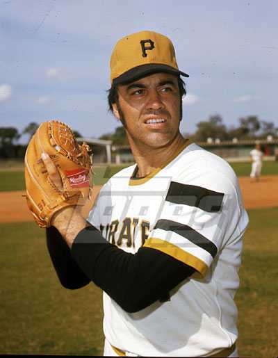 I've noticed quite a few Pirates TV photos from the early '70s in which the players have a strip of black material on their shoulder where a patch might normally go. (See Dave Giusti below as an example). They seem to differ in size from player to player and seem to be affixed loosely. I know they wore a small number 21 in a circle in honor of Clemente during 1973 - could these have been meant to cover them up until their "official" debut perhaps on opening day? Seems it would have been easier to simply put them on the day before. If anyone can help explain this, it would be appreciated.