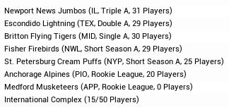 I am GM only, and want my Assistant GM to set up the minor leagues. This is how he does it. I want each of my teams to be fielding a roster of somewhere in the 20-30 range, but this guy leaves one roster completely blank. Most of the people at Short Season A have down arrows on them, so that's not the issue.