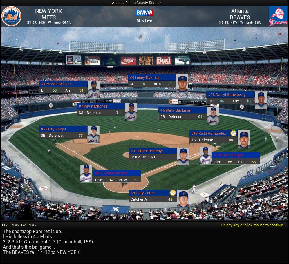 I dont know how to say this, but Bruce Berenyi almost blew an 8 run lead in the bottom of the 9th inning. I know i should have yanked him out, but i wanted him to get some sort of accomplishment. He really stinks! But the NY Mets take game 1 of this doubleheader against the ATL Braves 14-12 @ Atlanta-Fulton County Stadium. Dr. K gets the win, his 14th of the year. Everyone in the Mets lineup got on base, while Kevin Mitchell went 5 for 6 in todays game with 2 RBIs. He gets the Mets Man award. The Straw hit his 13th HR of the year, too. Trust me, i know i should have done the bottom of the 9th differently, but i really wanted to see if Berenyi was that bad! He is! Anyway, we have another game to play this evening. RP: 55-37 RL: 63-29 (3-4 Loss @ ATL) -8