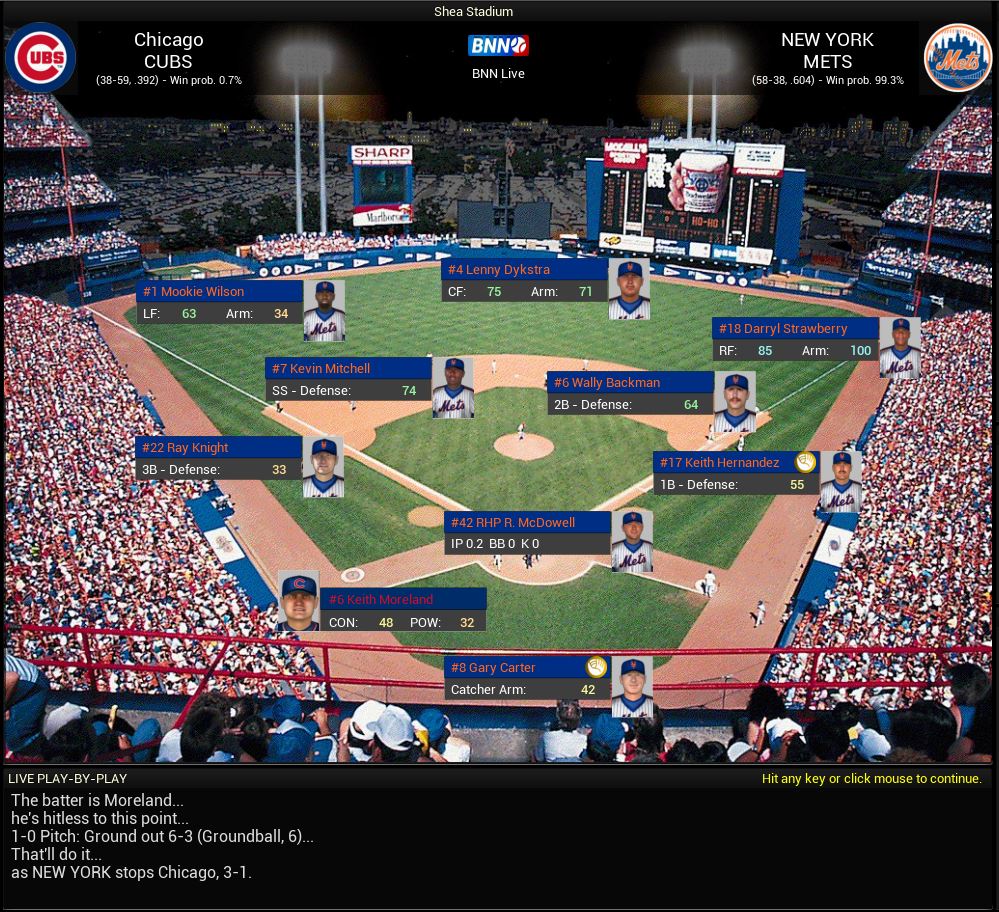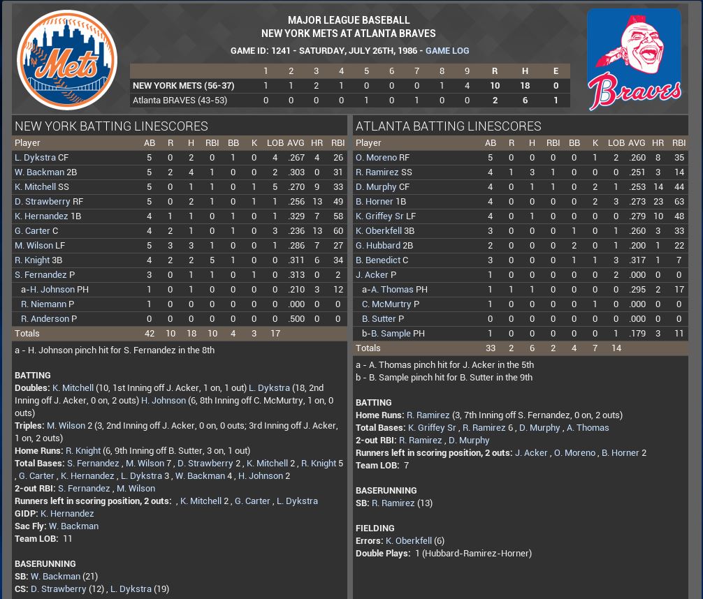 I just read through this whole Dynasty today. 1986 was really the first year I got into baseball. I went to my first game that year. Being from MA, I am a huge Sox fan and then as an 8 year old kid I remember my parents recording the World Series games for me because I could never stay awake until the end of the games. I remember them not telling me how game 6 ended and let me watch it for myself. I now think I may want to try this from the Red Sox side of 1986. I know you are using exact lineups for the Mets each game but do you think the fact there is a 9 game difference between RL and this is in part because you aren't facing the exact lineup/pitcher of the opposing team? I mean 9 games isn't really a huge number and can be made up but just something I thought of while reading through. Can't wait to see how this ends up!