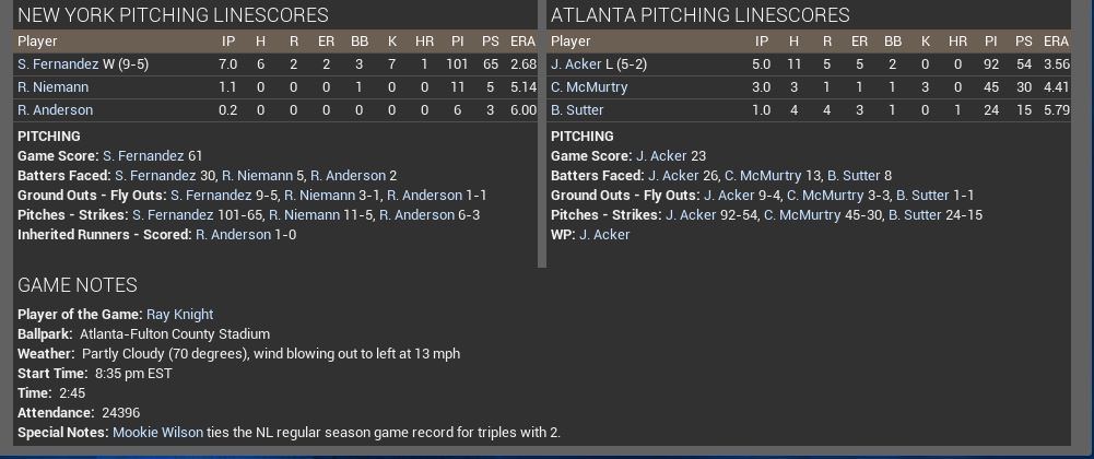 Will someone please tell me where this offense has been all year? The NY Mets again embarrass the ATL Braves 10-2 in the 2nd game of the doubleheader @ ATL-Fulton County! El Sid gets his 9th win of the year, and this time, my bullpen does not allow a close call. We are now on a 5 game winning streak! Wally Backman was 4 for 5 with an RBI tonight, so he is the Mets Man winner. For the 2nd game in a row, every Mets player gets on base, only this time, every one in the lineup got a hit. Ray Knight smacked a grand slam HR in the top of the 9th inning, to really put the game away for the Mets. After running the bases, he came into the dugout and sat down next to me and Gary Carter. He said, "Did i hit a Grand Slam as good as Gary?" I looked at him and smiled and said, "Yes, you hit grand slams BETTER than Carter. Im very proud of you, Ray!" I think "The Kid" heard me. Because, when i got back to my hotel room after the game, and i laid down in my bed, someone had put shaving cream all over my mattress and pillows! I had Barbasol all over me! "CARTERRRRRRRRRRRR!!!!!!" RP: 56-37 RL: 63-30 (Loss @ ATL 5-8) -7