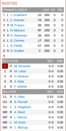 Zimmer replaces Fields in the lineup vs lefties. Wieters, Smoak, Carpenter, Flaherty, and Parra make up the rest of the playoff roster. Parra beat out Ceciliani because he is the only other OF that plays good defense in RF. I wish that I would have remembered that I wanted to take one less P. That spot would have gone to CF/SS/PR Roman Quinn. For the Rockies, Rosell Herrera get starts vs lefties replacing Alex Bregman. C Wilfredo Rodriguez, 1B Rowdy Tellez (51 HR in 2017), OFs Wes Rogers and Eury Perez, and P Ivan Nova fill out the rest of the squad. |