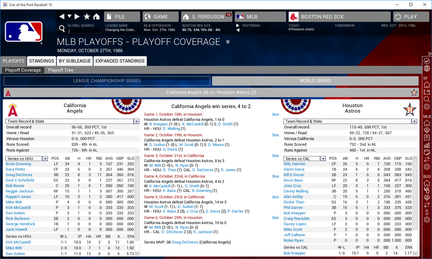 The California Angels are your 1986 World Champions!! They defeat the Astros 4-2 in the World Series!