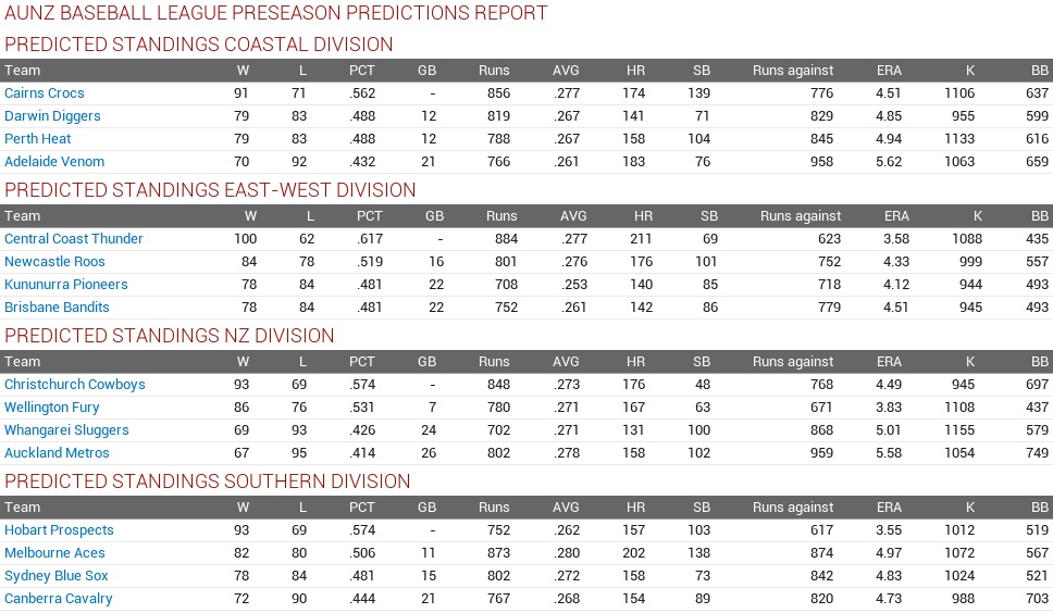 Coastal: Cairns' offseason moves looked set to pay dividends, with it being picked that they would run away with the Coastal Division. Darwin and Perth would finish tied for 2nd, but below .500. East-West: Central Coast would continue their dominance, finishing with the best record in the league. Newcastle would finish 2nd in the division. NZ: Despite their weak rotation and less formidable (than last season) lineup, Christchurch would take out the NZ division, 7 games ahead of a competitive Fury. Southern: Hobart's moves would also pay off, as they would win the division comfortably, Melbourne their closest competitors but not in the hunt. Wildcard: Fury and Roos, with Melbourne providing competition but ultimately missing out. Slugger of the Year: Central Coast's John Foreman was the favourite pick, with Richard Moore, Justin Auger and Ismael Aguirre to make up the chasing pack. Hurler of the Year: Last year Ethan Humphries was picked to break out, but ended up breaking down instead, spending the majority of the season on the DL with a partially torn UCL. This season he was picked to be HotY when all was said and done, 2057's big winner, Clint Aitcheson, hot on his heels along with Ralston and Hobart's Bradley Boston. ABC: Alice Springs, Sydney, Kalgoorlie, and Jakarta were picked to be the postseason teams, though most analysts felt picking anything for the inaugural season of the new league was a crapshoot. Zhu Que (Alice Springs) and Adare Subadia (Kalgoorlie) were predicted to be the best hitters in the league, while Rhys Susanti (Jakarta) and Tristan Agar (Alice Springs) would be the best pitchers.