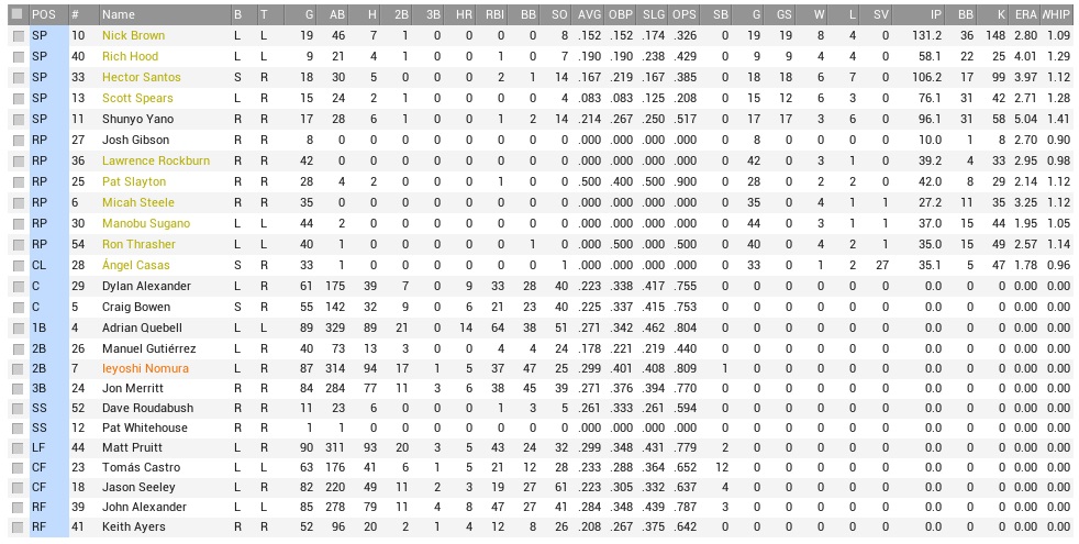 The Falcons weren’t scoring a lot of runs at all, just over 3.9 per game for 11th in the Continental League. Their pitching was sound, with the third-best rotation and a capable bullpen, but that couldn’t keep them afloat, as they still ran a -38 run differential. They were already buried by 27 games by the Thunder. Against the dear Coons, they were 3-3 on the season. Projected matchups: Nick Brown (9-6, 2.78 ERA) vs. Steve Kreider (9-8, 3.80 ERA) Shunyo Yano (3-8, 5.15 ERA) vs. Donnie Fitzgerald (1-6, 7.30 ERA) Rich Hood (5-4, 3.84 ERA) vs. Adrian Valencia (9-5, 3.23 ERA) Southpaw on Wednesday, and we might get two more on the weekend in our 4-game set in Indy. Sandy Sambrano had already started rehab in St. Pete on Saturday. Michael Palmer was scheduled to go there by Wednesday. Both could rejoin us on the weekend. Maybe. Tomas Castro was also expected back by the weekend. Getting this team healthy might do more good than randomly swapping prospects for more Richard Williams-types. Game 1 POR: 2B Nomura – CF Carmona – LF Pruitt – 1B Quebell – 3B Merritt – C D. Alexander – RF Ayers – SS M. Gutierrez – P Brown CHA: LF DeBoer – CF J. Jimenez – 3B Ladd – 1B J. Diaz – RF Nieves – 2B Da Silva – C T. Turner – SS Pollack – P Kreider The Coons took a 1-0 lead when Yoshi opened the game with a double and scored on Carmona’s single – the first RBI in Carmona’s extremely underwhelming debut – but Brownie didn’t have anything in terms of stuff, and when that combined with nightmare defense in the second inning, the Falcons easily threw three runs onto the board, two of which were unearned after a Gutierrez error, and they scored on a Jimmy DeBoer bloop to shallow left in which Matt Pruitt and Gutierrez were too concerned not to break a claw rather than actually going after the ball, which fell in for the 2-out, 2-run single, on a 2-2 pitch. No strikeouts through two innings for Brownie, who would pick up a few against the bottom of the order later, but this start was to be filed away under the category “gruesome”. He did lead off the fifth with a single, though, bringing the tying run to the plate. Nomura struck out, but Carmona found the gap for a double that put the tying runs in scoring position with one out. Matt Pruitt had singled in his last at-bat, extending a hitting streak to 11 games, so he had done his day’s work and grounded out to first, an example that Quebell followed instantly. The Coons had the exact same offensive opportunity again in the sixth inning: D-Alex singled, Ayers doubled, which brought up Gutierrez, unfortunately. John Alexander hit for him, which only led to an intentional walk, and now we only had right-handed chumps and the automatic strikeout Craig Bowen available to hit for Brownie. **** it, let Brownie do the magic. At least he bats left-handed. 2-1 pitch lined to right, OVER Maxime Da Silva, into right, Ayers turning third, he’s in to score, tied ballgame! The top of the order excused themselves from participation then, leaving J-Alex and Brown on base. Brown responded to his own heroics by walking leadoff man Domingo Nieves on four pitches in the bottom 6th, and with Nieves at second nursed another 3-0 count to Tom Turner, who then grounded out to Yoshi, moving up Nieves. That brought up blink-and-you-miss-him ex-Coon Melvin Pollack, who had a grand total of 11 AB on the year, had struck out already in the game, and was probably an easy meal for Brown again, and indeed Brown retired him on a casual grounder to Dave Roudabush at short. Kreider departed after two leadoff walks in the top 7th, but Hoshi Watanabe found some tool to hit into a double play all too readily (Dylan Alexander), Brown was left with a no-decision eventually. Quebell had runners on the corners with one out in the top 9th and hit into a double play as well. The Coons found their way to the tenth inning, in which they left the go-ahead run on second base when Roudabush struck out, and in the bottom of the frame it Micah Steele to shovel the bases full with nobody out. Ron Thrasher replaced him to try and save the forsaken, but walked in the winning run against RELIEVER Matt Collins. 4-3 Falcons. Nomura 2-5, 2B; Carmona 2-5, 2B, RBI; Pruitt 2-4, BB; D. Alexander 2-4, 2B; Brown 7.0 IP, 8 H, 3 R, 1 ER, 1 BB, 6 K and 2-3, 2 RBI; THEY ARE SO GODDAMN AWFUL!!! By the way, Nick Brown over his last seven games: 2-3 with a 1.48 ERA and 54 K in 48 2/3 innings. 2-3!! Donnie Fitzgerald got shafted before the middle game and was replaced by Alfredo Collazo (9-10, 4.19 ERA), another righty. Game 2 POR: 2B Nomura – CF Carmona – LF Pruitt – 1B Quebell – RF J. Alexander – 3B Merritt – C D. Alexander – SS Whitehouse – P Yano CHA: LF DeBoer – 1B J. Diaz – C F. Chavez – 3B Ladd – CF J. Jimenez – RF Nieves – 2B C. Aguilar – SS Da Silva – P Collazo Collazo was completely bonkers and issued walks, wild pitches, and also a few hits without any huge formalities. Ask and you receive. The Raccoons asked, got the bases loaded with nobody out in the top 2nd and scored two runs on a wild pitch and a groundout by Whitehouse, then got two more runs in the third despite leadoff man Ricardo Carmona getting caught trying to steal third base. More runs were always better with the horrible Shunyo Yano pitching, and the Coons saddled Collazo with six runs on seven hits and four walks in five innings. The last hit was a 2-run homer by D-Alex, tying him for the team lead in dingers with Quebell. Yano made it through six with a 3-hit shutout, and we were a bit worried that something might be wrong with him, but when the Falcons came back to waffle him for four hits and two runs and knocked him out in the bottom 7th, we were relieved to see that he was still in normal condition. Manobu Sugano inherited two on with one out, filled them up with a single by Maxime Da Silva, but then struck out PH David Rincón and got a soft line right to Yoshi from Jimm