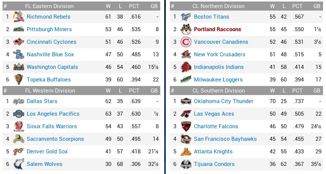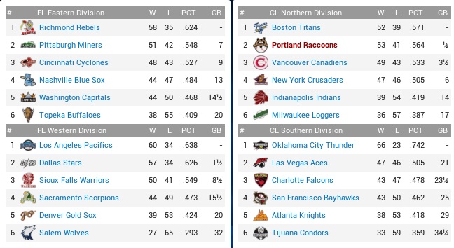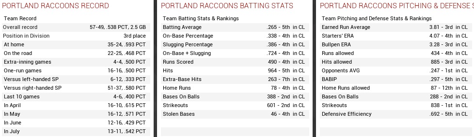 While their pitching was sound, the Condors’ offense was outright dismal, scoring the least runs in the Continental League. They were really at the bottom of the table or very close to it in almost all categories on offense, except for stolen bases (t-7th). They did have the third-best rotation in the CL, but it wasn’t helping them on bit, lingering in last place in the South, 39 1/2 games out in August. Yet, somehow, they were 4-2 against these Raccoons this season, which was not something to be proud of in Coon City… Projected matchups: Nick Brown (11-8, 2.76 ERA) vs. Manuel Rojas (7-9, 3.71 ERA) Scott Spears (8-4, 3.09 ERA) vs. Dave Hogan (6-7, 5.82 ERA) Rich Hood (7-5, 3.27 ERA) vs. Jaylen Martin (9-11, 3.19 ERA) These are all right-handed pitchers. They also had a few batters on the DL, including Tomas Cardenas, so they were even missing some of the little talent they carried around. Game 1 TIJ: 3B Dasher – 2B Dougal – 1B May – RF Branch – CF Feldmann – LF Eroh – C R. Rodriguez – SS M. Miller – P Rojas POR: 2B Nomura – SS Palmer – LF Pruitt – 1B Quebell – RF Carmona – 3B Merritt – CF Castro – C Bowen – P Brown Both sides would make plenty of outs on the base paths in this game. Ron Eroh was caught stealing in the top 2nd, Tomas Castro was thrown out on a long single that was really not a double in the bottom of the same inning, and Carmona was gunned down at third on a double steal going foul in the fourth. However, Quebell’s leadoff triple in the bottom 2nd had led to the game’s first run, and the Raccoons put up three in the bottom 4th despite Carmona’s mishap, with one run singled home by Brownie with two outs after Bowen had received an intentional walk. The same situation transpired again in the bottom 6th, when Castro was on first with two outs, made it to third on a stolen base attempt during which Rafael Rodriguez airmailed the ball to centerfield, and Bowen was walked again, but this time Brownie grounded out to second base. On the mound, despite facing a lineup of beggars, Nick Brown was not dominant at all, lacking the last bit of bite to get people struck out. The Condors readily put balls in play even with two strikes, but were still shut out over seven innings with four singles and two walks. It was good enough then for Brownie. Micah Steele managed to pitch a scoreless eighth, not something anybody was putting money on in a sane mind, but Pat Slayton only faced one batter in the ninth and was taken deep by Nick May. With a left-hander in Ezra Branch next, Manobu Sugano replaced Slayton right away, whiffed Branch, and then finished the game since he was already on it. 4-1 Brownies! Quebell 2-4, 3B; Merritt 1-2, 2 BB, RBI; Castro 3-4, RBI; Brown 7.0 IP, 4 H, 0 R, 2 BB, 5 K, W (12-8) and 1-3, RBI; The Elks were destroyed, 9-1, by the Thunder, which put the Raccoons into the lead in the North! Game 2 TIJ: 3B Dasher – 2B M. Miller – LF Crum – 1B R. Morris – C Bedinghaus – CF Feldmann – RF Newman – SS Eroh – P Hogan POR: 2B Nomura – SS Palmer – LF Pruitt – 1B Quebell – C D. Alexander – 3B Sambrano – RF J. Alexander – CF Castro – P Spears Spears was in trouble in due time. Johnny Crum was close to hitting one out in the first inning, and the Condors loaded the bases with three singles in the second before Spears arrived at Hogan just in time to escape the nightmare with the third out registered on a pop. The Raccoons responded with two walks drawn by Quebell and Sambrano in the bottom of the inning before Castro singled with two outs, scoring Quebell, and that set off a string of four straight 2-out singles, plating four runs in the inning! The 4-run outburst did little to calm a seemingly nervous and insecure Spears, who missed the zone far and wide occasionally, and sometimes came down the middle real good. The Condors were inept, however. They put five men on across the next three innings, and stranded all of them, while John Alexander hit a solo homer in the fourth to extend the lead to 5-0. Carmona hit for Spears in the bottom 6th with our starter already over 100 pitches, while somehow keeping up shutout ball. A sac fly by Carmona brought in Sambrano from third, 6-0, and the ball was handed to Richard Williams to pitch two or maybe even three innings here, and indeed he breezed through the last three innings on just 30 pitches, and it really wasn’t all hard contact at all. The Coons had added a run on a Pruitt groundout in the last few innings. 7-0 Critters. Nomura 2-4, 2B; Palmer 2-4, 2 RBI; Castro 2-3, RBI; Spears 6.0 IP, 7 H, 0 R, 2 BB, 5 K, W (9-4) and 1-2, RBI; Williams 3.0 IP, 2 H, 0 R, 0 BB, 2 K, SV (2); This is Williams’ first save with the Raccoons. He got his other save with the Loggers earlier this year. Game 3 TIJ: 3B Dasher – 2B Dougal – 1B May – C Bedinghaus – CF Feldmann – RF Raupp – LF Newman – SS M. Miller – P J. Martin POR: 2B Nomura – SS Palmer – LF Sambrano – 1B Quebell – CF Carmona – C D. Alexander – 3B Merritt – RF J. Alexander – P Hood Jaylen “Midnight” Martin on paper was by far the best player on the Condors, who sent a cleanup batter in Bill Bedinghaus well under .200 in batting average. The Condors got an early jump this time, with Rich Hood, who faced an entirely right-handed lineup, conceding two singles and a walk to load the bases, then allowed a 2-run double to Ryan Feldmann to fall behind in the first inning. Jimmy Raupp struck out and Will Newman rolled out to Hood, but that was some early damage, and “Midnight” was no pushover. The Coons got a leadoff double from Yoshi in the bottom 3rd, and just barely managed to drag him over home plate before the inning ended, and aside from that looked pretty puzzled by Martin. By contrast, Rich Hood never gained control of a ghastly underpowered lineup and conceded another run in the second (involving a bad throw by Pruitt) and one more in the fifth, while showing no sparkle wha
