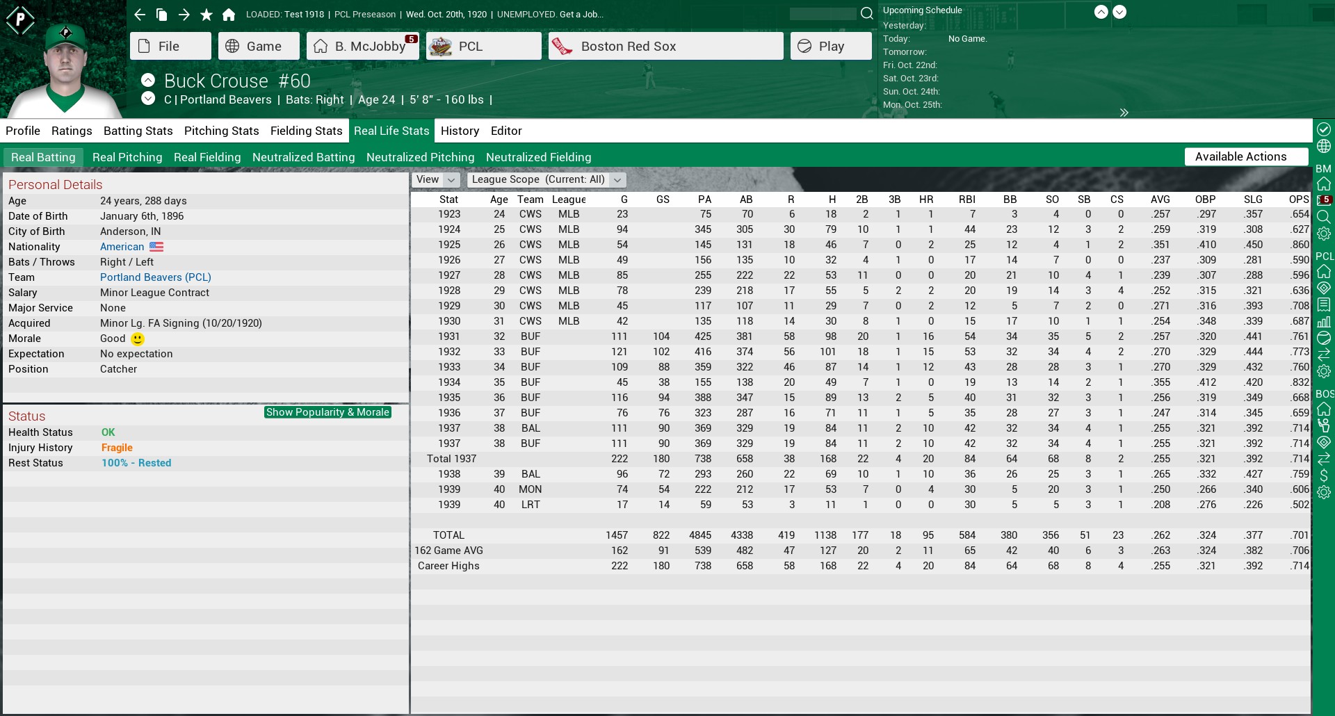 Buck Crouse. His DOB is listed here as 1896. In BBref and Wikipedia, it's given as 1897. Either way, he certainly wasn't 24 years in 1923, as shown on his Real Life Stats. What gives?